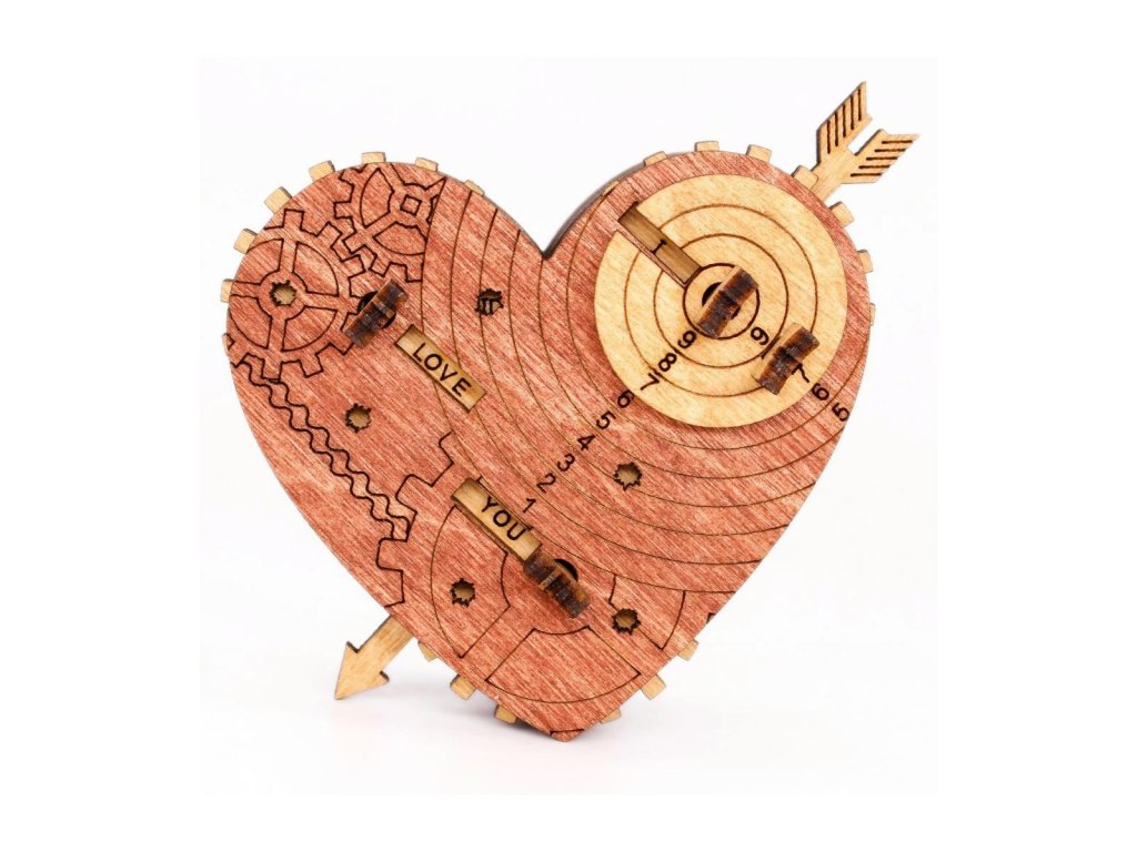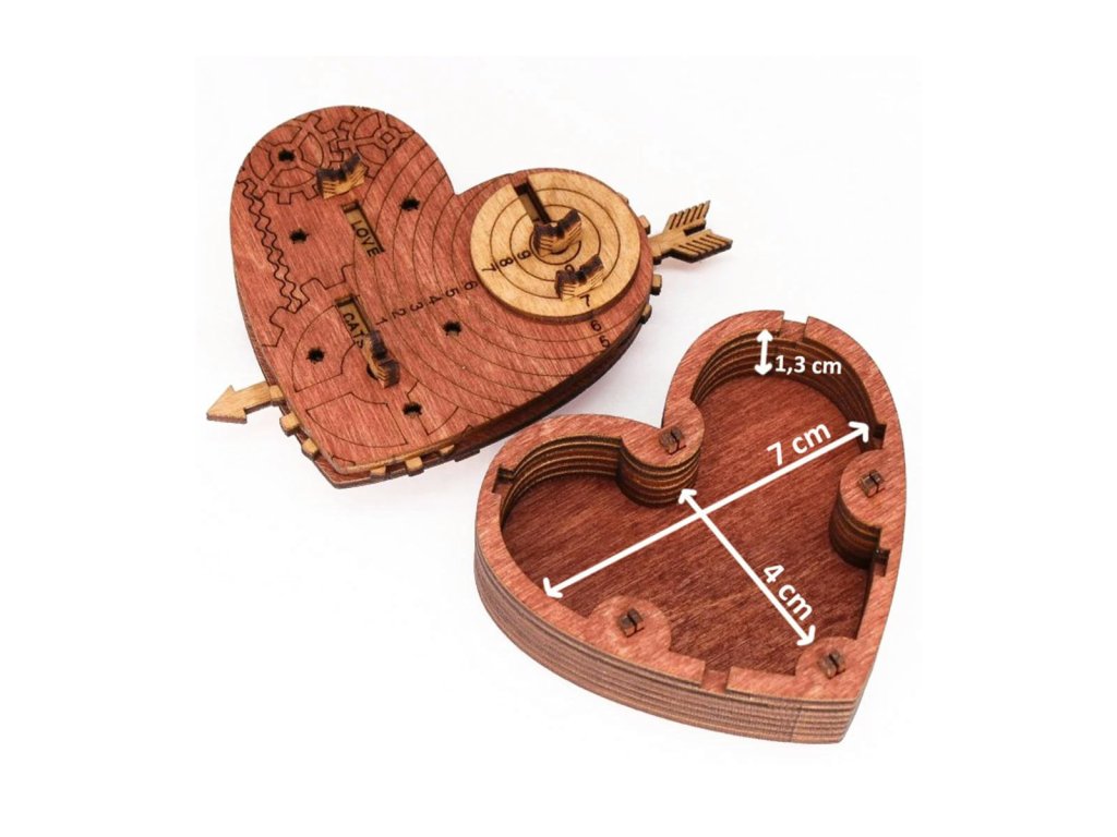 Tato krabička a trezor v jednom ve tvaru srdce je vhodná jako dárek na Valentýna nebo pro jinou podobnou příležitost. Je opatřen kódovým zámkem a klíčem k otevření je věta složená ze tří slov, kterou lze obměňovat. Kódovou větu můžete vybírat z více než 50 slovních spojení. Kód se skládá ze tří slov a z daných možností si můžete vybrat kombinaci, která vám nejlépe vyhovuje. Výchozí kód je: I LOVE YOU. Pokud chcete být romantičtí, nastavte klíč I LOVE YOU nebo TAKE MY HEART anebo zanechte zábavnou zprávu jako např. I LOVE BEER. Na každém ze tří koleček je 8 slov a více než 50 možných kombinací. Tato stavebnice je skvělý dárek, který lze využít i jako netradiční obal na dárek. Hlavní vlastnosti: vhodné jako dárek nebo nápaditý obal na dárek více než 50 možných kombinací hesla pro otevření vyrobeno z kvalitního březového dřeva Možnosti kódové věty: Na každém kolečku je 8 možností/slov. Můžete použít všechny možné kombinace k nastavení klíčové věty, která Vám nejlépe vyhovuje. Zde jsou možnosti slov, která můžete použít ve Vaší kódové větě: kolečko 1: I, SAVE, I’M, YOU’RE, FIND, BE, TAKE, OPEN kolečko 2: LOVE, HATE, BEST, SWEET, MY, YOUR, WANT, LUCKY kolečko 3: YOU, PUZZLE, HEART, SEX, JULIET, BEER, VEGGIE, ROMEO Zde je několik nápadů pro Vaši inspiraci: Take my heart / I want you / I love puzzle / I hate puzzle / I hate veggie / Be my Romeo or Juliet/ Open my heart / I want sex / You're sweet heart atd. Pokud se rozhodnete změnit kódovou větu, ujistěte se, že jste nezapomněli tu, kterou jste nastavili. Jak srdce otevřít: K otevření srdce potřebujete znát kombinaci tří slov. Výchozí kód pro srdce je I LOVE YOU. Po nastavení správných slov zatáhněte za šipku a otevřete víko srdce. Viz foto a video vysvětlení níže. Jak změnit kódovou větu: Kódovou větu lze změnit za méně než 2 minuty, pokud budete postupovat podle tří níže uvedených kroků. Podrobnější pokyny naleznete na této stránce.Doplňkové parametry