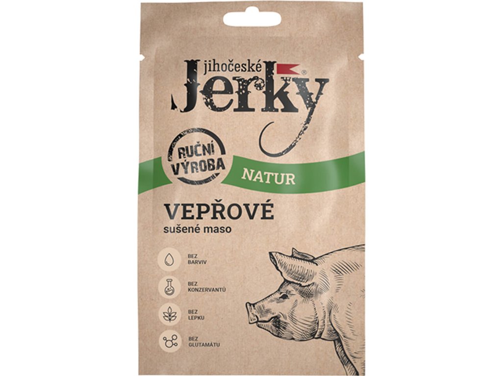 Jihočeské Jerky Vepřové natur je poctivá sušená pochoutka, která sází na jednoduchost a kvalitu. Vyrobeno ze 100% čisté vepřové svaloviny pocházející z českých chovů, sušené a jemně zauzené tak, aby vynikla přirozená chuť masa bez zbytečných dochucovadel.