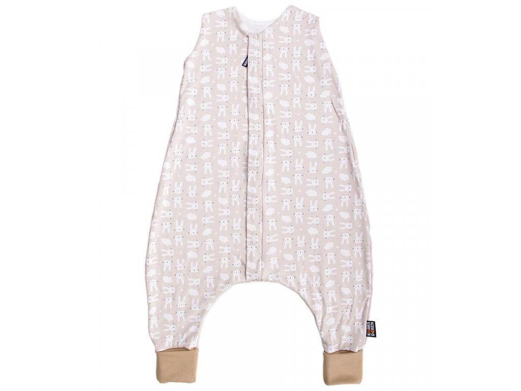 Letní dětský spací pytel s nohavicemi béžový s motivem zajíčků a obláčků, dítě v něm může volně kopat nožičkami. Délka spacího pytle je cca 80 cm, lze jej prát v pračce při 30 °C. Délka spacího pytle odpovídá výšce dítěte k ramenům. Spací pytel má uprostřed zip a lze jej zcela otevřít, navíc má zip látkovou krytku, která zabraňuje přiskřípnutí krku do zipu. Spací pytel je ušitý ze dvou vrstev: vrchní materiál 100% bavlna, podšívka 100% bambusová viskóza. Česká výroba.