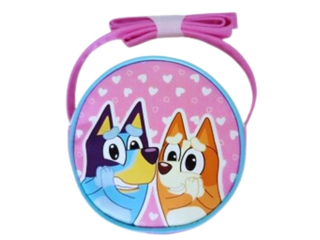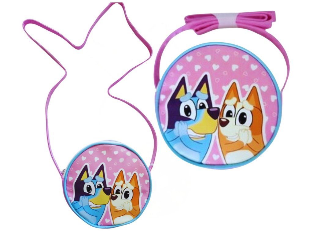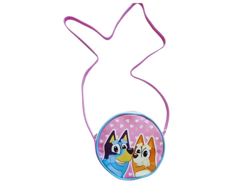 Dětská kulatá kabelka přes rameno s motivem postaviček Bluey a Bingo z populárního animovaného seriálu Bluey. Kabelka je růžová s bílými puntíky ve tvaru srdíček a má růžový popruh přes rameno. Na přední straně jsou vyobrazeny postavičky Bluey (modrý pes) a Bingo (oranžový pes). Jedná se o oficiálně licencovaný produkt Bluey, určený pro malé fanoušky seriálu. Kabelka je ideální pro přenášení drobných hraček, svačiny nebo jiných nezbytností pro děti. Rozměry: 16 x 16 x 4 cm. Materiál: 100% polyuretan, podšívka 100% polyester. Pro děti od 3 let. Oficiální licence. E plus M sp. z o.o. 05-500 Łoziska ul. Fabryczna 5 e-mail: b2b@eplusm.plDoplňkové parametry