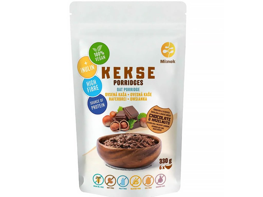 Kekse Ovesná kaše čokoláda a lískové oříšky je poctivá kombinace jemně nasládlé chuti, kvalitní 60% vegan hořké čokolády a křupavých lískových oříšků. Kaše je přirozeně bez lepku, jemně slazená přírodní palatinózou a obohacená o inulín z čekanky, který dodává příjemnou texturu a pomáhá navodit pocit sytosti.