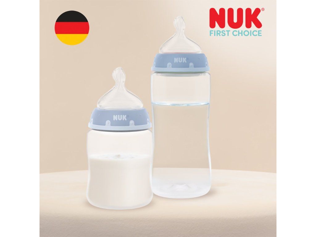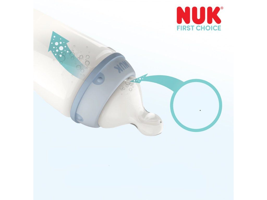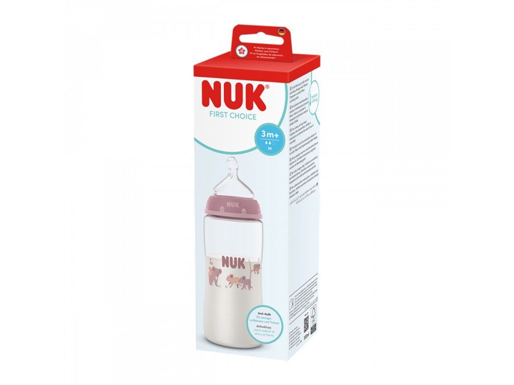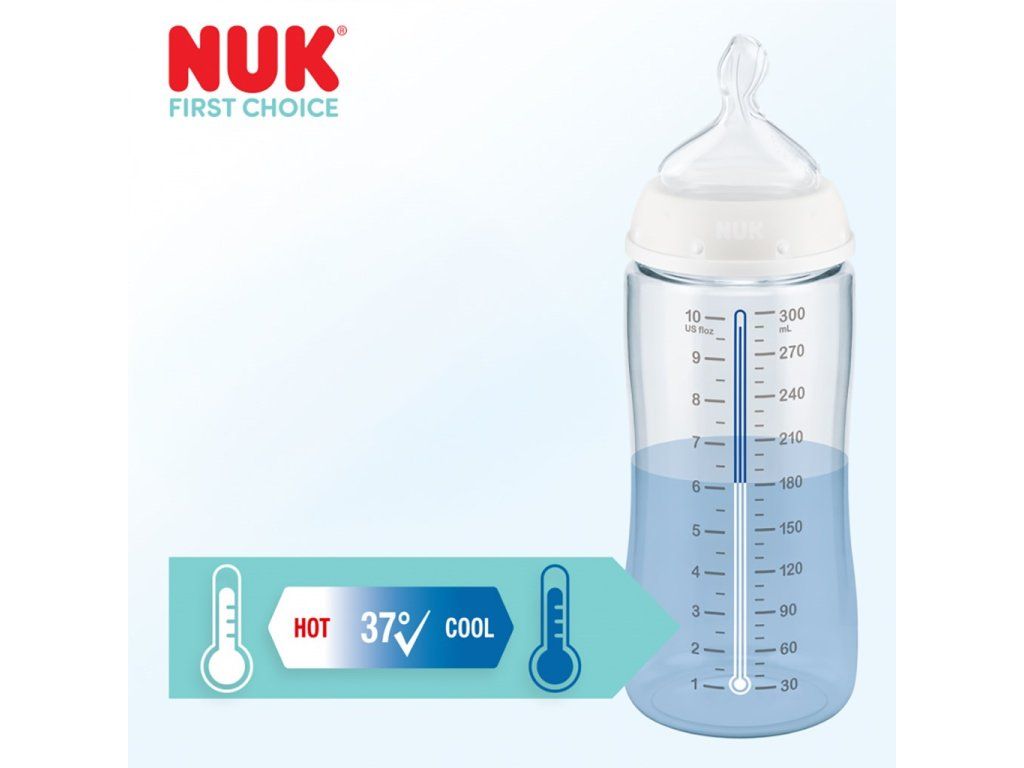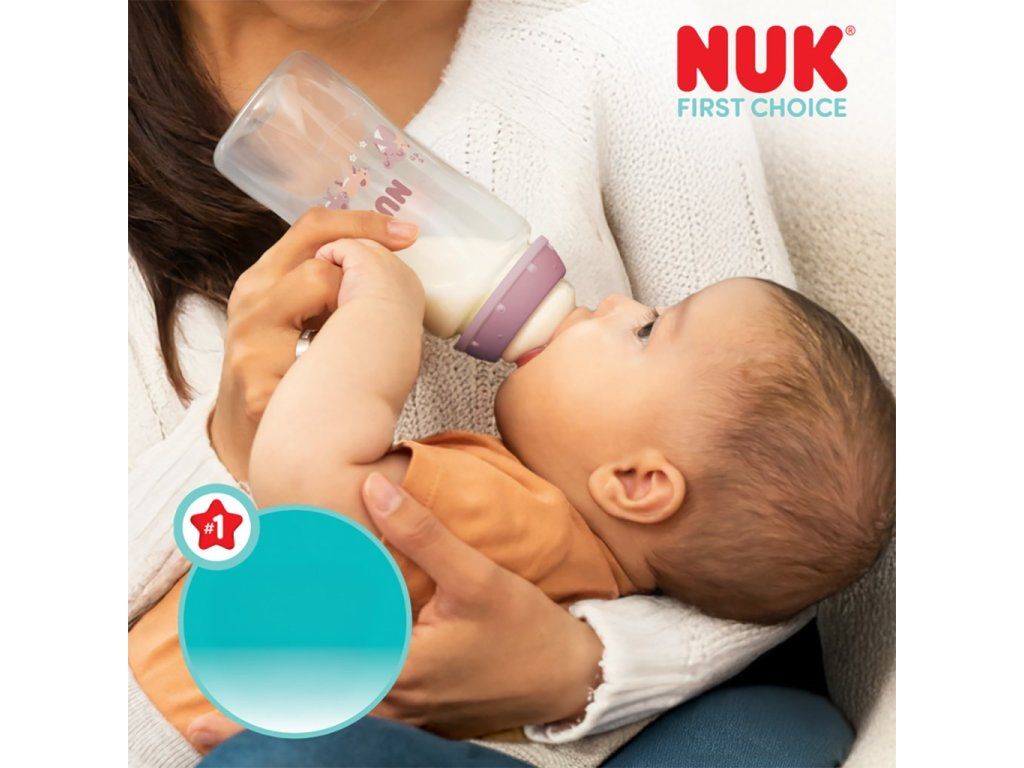 Krásná kojenecká láhev NUK First Choice s kontrolou teploty. Speciální tvar typický pro savičky NUK s ortodontickou antikolikovou savičkou je modelován podle mateřské bradavky při kojení. Ponechává dostatek prostoru pro přirozené sací pohyby jazyka i čelisti. Vylepšený systém proti polykání vzduchu při pití Anti Colic Air System zajišťuje přirozený tok mléka, aby dítě pilo uvolněně bez polykání vzduchu. Kojenecké láhve jsou nyní vybaveny novou NUK kontrolkou teploty a pomáhají tak zabránit tomu, aby vaše dítě pilo příliš horký příkrm. Kontrolka vypadá jako teploměr, je umístěna mezi ryskami a teplota obsahu láhve změní její barvu. Pokud je příkrm příliš horký, modrá kontrolka se změní na bílou. V ideálním případě by měl příkrm mít tělesnou teplotu (37 °C), což odpovídá modrému zabarvení displeje. Vyrobena z vysoce kvalitního nerozbitného plastu polypropylenu a neobsahuje BPA (Bisfenol A). Obsah láhve 300 ml. Vhodná pro děti od 3 měsíců M (středně velký otvor = pro dětskou výživu). Klinicky testováno.