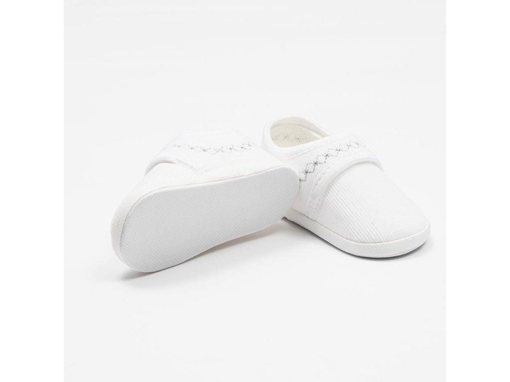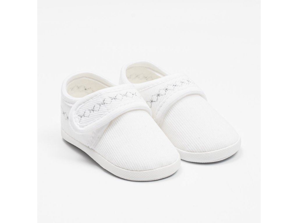 Kojenecké capáčky New Baby pro miminka. Krásné botičky s moderním vzhledem na suchý zip, zdobené stříbrnou výšivkou. Capáčky přiléhají k nožičce a mají široký vnitřek, což umožňuje volný pohyb prstů a svalů. Výrobek není určen k chůzi. Jsou velmi lehké s tenkou syntetickou podrážkou.