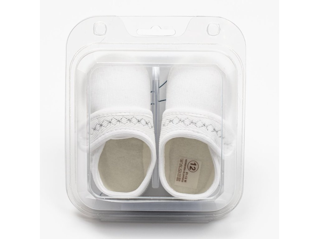 Složení: 100% polyester. Podrážka: syntetický materiál PVC bez BPA. Délka vnitřní stélky 10 cm. Určeno pro děti 0-3 měsíců. Dodávané v praktické krabičce. Upozornění: pod textilní vložkou se někdy nachází papírová vložka, která drží tvar capáčky. Před prvním použitím odstraňte tuto papírovou vložku.