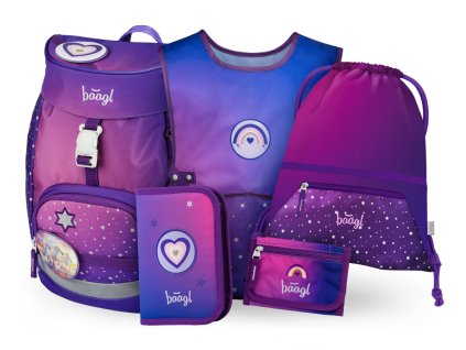 Fialový školní set pro všechny milovnice koní. Najdete v něm vše potřebné pro budoucí prvňačky - aktovku ERGO, penál, sáček, desky na sešity a box na svačinu.