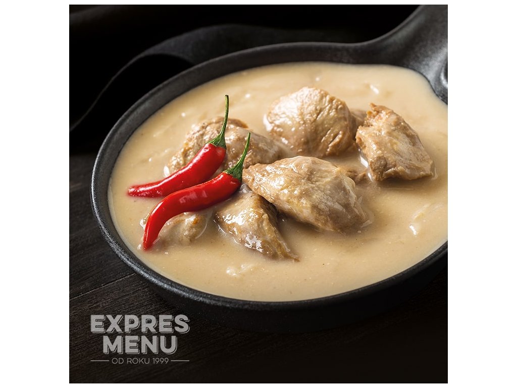 Vepřová kýta (33 %), hovězí vývar (voda, hovězí maso a kosti), cibule, smetana, rýžová mouka, kukuřičná mouka, řepkový olej, sůl kamenná, pepř, chilli.