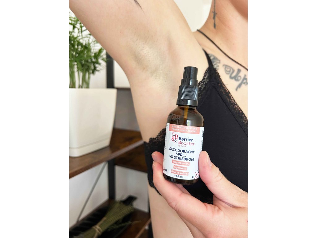 Kvitok Barrier Booster deodorant ve spreji se stříbrem poskytuje jemnou ale účinnou ochranu proti vzniku nepříjemného tělesného zápachu. Díky inovativnímu složení se stříbrem, extraktem ze sečuánského pepře a zinkem účinně předchází množení bakterií způsobujících zápach, zatímco pokožce umožňuje její přirozené pocení. Neobsahuje hliníkové soli, alkohol, esenciální oleje ani alergenní složky, proto je skvělým řešením také pro velmi citlivou pokožku nebo děti od 10 let.