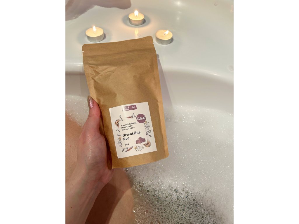 Magická pěna do koupele s orientální vůní santalu, vanilky, pačule a bergamotu v práškové formě vám umožní užít si relaxaci plnou jemných bublinek, které dlouho udržují vodu příjemně teplou. Obohacená o epsomskou sůl, jež poskytuje cenný hořčík, pomáhá odbourávat napětí, zatímco mandlový olej zanechá pokožku hebkou a hydratovanou. Pěna je opravdu bohatá a vydrží až překvapivě dlouho. Neobsahuje syntetické parfémy ani barviva, takže je vhodná pro vegany a citlivou pokožku.Doplňkové parametry