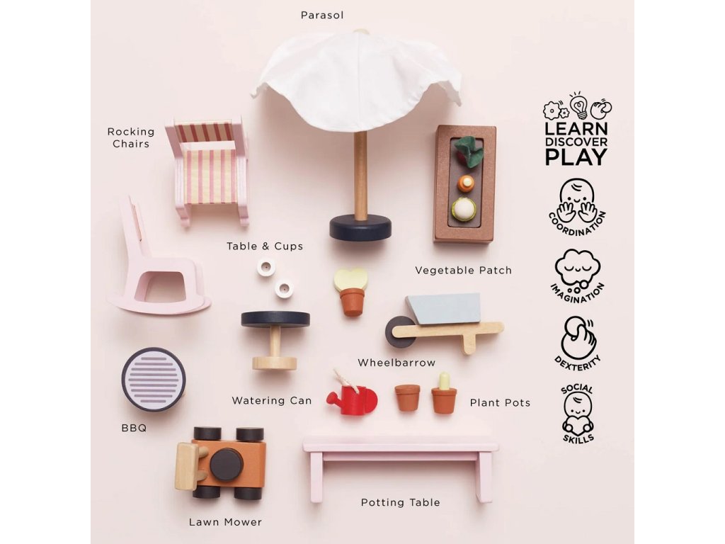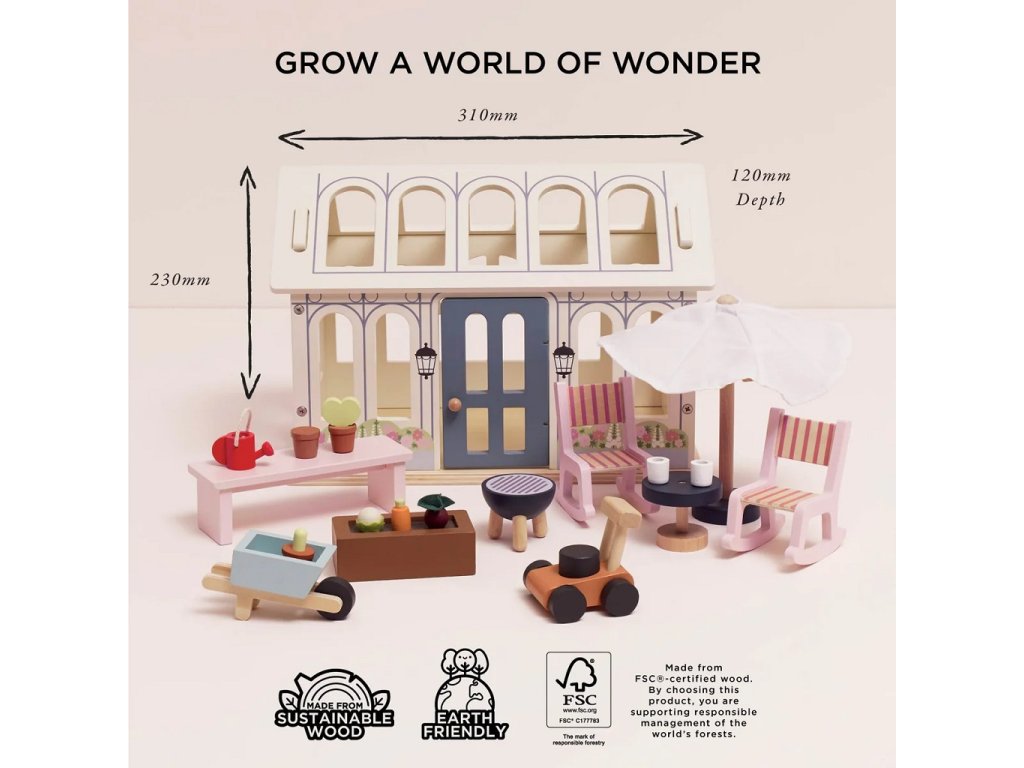 Proměňte dětský pokoj v kouzelnou mini zahradu plnou fantazie. Dřevěný zahradní domeček pro panenky je ideální k jakémukoliv domečku pro panenky. Díky odnímatelné střeše má dítě snadný přístup k hraní a aranžování interiéru. Domeček je zhotoven z FSC® certifikovaného dřeva, malován netoxickými vodovými barvami a splňuje přísné bezpečnostní normy pro hračky.Součástí setu jsou realistické detailní doplňky: zahradní nábytek, posezení, květináče, gril, taburetky, zahradní nářadí jako sekačka nebo kolečko, květinové truhlíky, květinové záhony a dekorace, to vše pro dokončení zahradní atmosféry, kterou si děti i jejich panenky zamilují. Tento zahradní domeček s doplňky podporuje kreativní a představivou hru, rozvoj fantazie, jemné motoriky a sociální hry. Děti mohou pěstovat rostliny a dobroty na zahrádce, uspořádat piknik, grilování nebo zahradní posezení pro svou panenkovou rodinu.„Dolls House Conservatory Playset“ se hodí jako doplněk k domečkům pro panenky. Je kompatibilní s ostatními domečky a nábytkem od stejné značky, ale výborně obstojí i jako samostatné hrací prostředí. Díky své velikosti a detailnímu zpracování se snadno stane centrem dětské hry a inspirací pro nekonečné mini příběhy. Hlavní vlastnosti: vyrobeno z FSC® dřeva otevírací dveřebohaté příslušenství – zahradní nábytek, květináče, gril, sekačka, dekorace a dalšíkompatibilní s domečky a nábytkem stejné značky, snadné rozšíření herního setu nebo kombinace s dalšími hračkamipodporuje kreativní hru, fantazii, jemnou motoriku a rozvíjí představivost Značka a certifikát FSC® (Forest Stewardship Council) zaručuje, že dřevo, ze kterého byl produkt vyroben, nebylo vytěženo nelegálně a pochází z lesů obhospodařovaných šetrným či přírodě blízkým způsobem, ve kterém jsou dodržovány přísné environmentální a sociální požadavky. Značka FSC® na výrobku znamená, že svým nákupem pomáháte chránit lesy a podporujete šetrné, odpovědné či přírodě blízké hospodaření, díky kterému jsou naše lesy stabilnější, zdravější, mají přirozenou druhovou skladbu a lépe odolávají negativním následkům klimatických změn.Doplňkové parametry