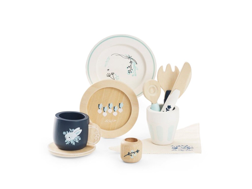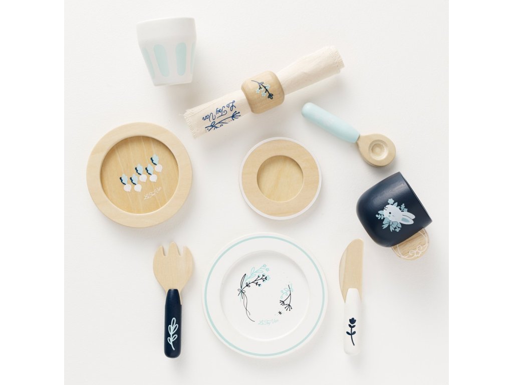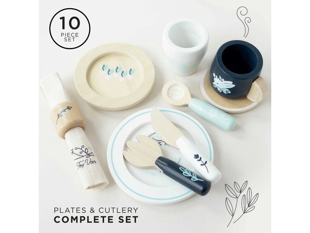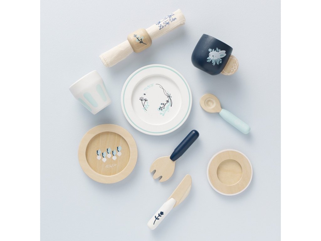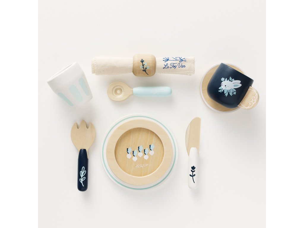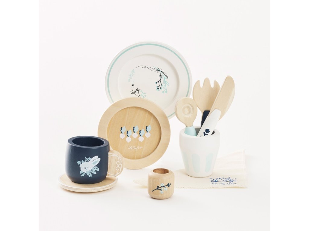 Oběd chutná lépe, když je servírován na pěkném nádobí. Tato hračka je udržitelná a vydrží vám opravdu dlouho. Přírodní barva dřeva, bílá a odstíny modré k sobě pěkně ladí, nechybí ani ilustrace rostlinek. V sadě najdete hrnek, podšálek, kelímek, 2 talíře, nůž, vidličku, lžíci a ubrousek s dekorativním kroužkem. Děti si při představivé hře procvičí jemnou motoriku, zručnost a koordinaci ruka-oko. Malováno netoxickými barvami na bázi vody. Hračky s účelemVšechny hračky firmy Le Toy Van jsou vyrobeny s cílem – aby dlouho vydržely. Designovány s láskou zkušenými řemeslníky za použití etických praktik a udržitelných materiálů, které jsou laskavější k naší planetě. Hlavní vlastnosti: vyrobeno eticky z udržitelného dřevatestováno dle nejpřísnějších standardůmalováno netoxickými barvami na bázi vodyinspiruje k představivé hřerozvíjí kognitivní dovednosti Honeybake kolekce: Hračky v této kolekci jsou vhodné k objevování, pomohou dětem s rozvojem představivosti, sociálních a verbálních dovedností a kognitivních funkcí. Tradiční design s moderními detaily děti jistě bude bavit. Honeybake je kolekce Le Toy Van, která vyhrála nejvíce ocenění, a to za design, kvalitu, bezpečnost a také za vzdělávací a herní hodnotu. Značka a certifikát FSC® (Forest Stewardship Council) zaručuje, že dřevo, ze kterého byl produkt vyroben, nebylo vytěženo nelegálně a pochází z lesů obhospodařovaných šetrným či přírodě blízkým způsobem, ve kterém jsou dodržovány přísné environmentální a sociální požadavky. Značka FSC® na výrobku znamená, že svým nákupem pomáháte chránit lesy a podporujete šetrné, odpovědné či přírodě blízké hospodaření, díky kterému jsou naše lesy stabilnější, zdravější, mají přirozenou druhovou skladbu a lépe odolávají negativním následkům klimatických změn.Doplňkové parametry
