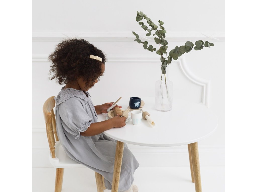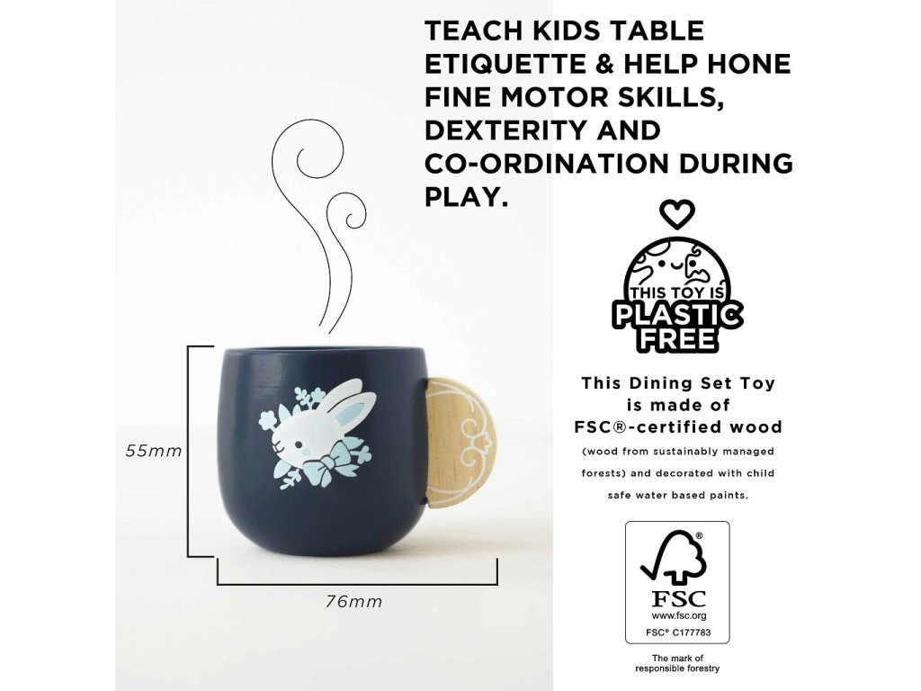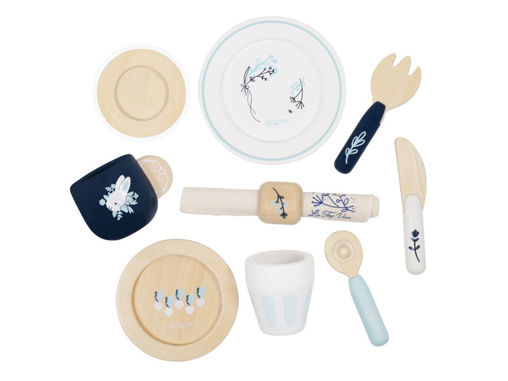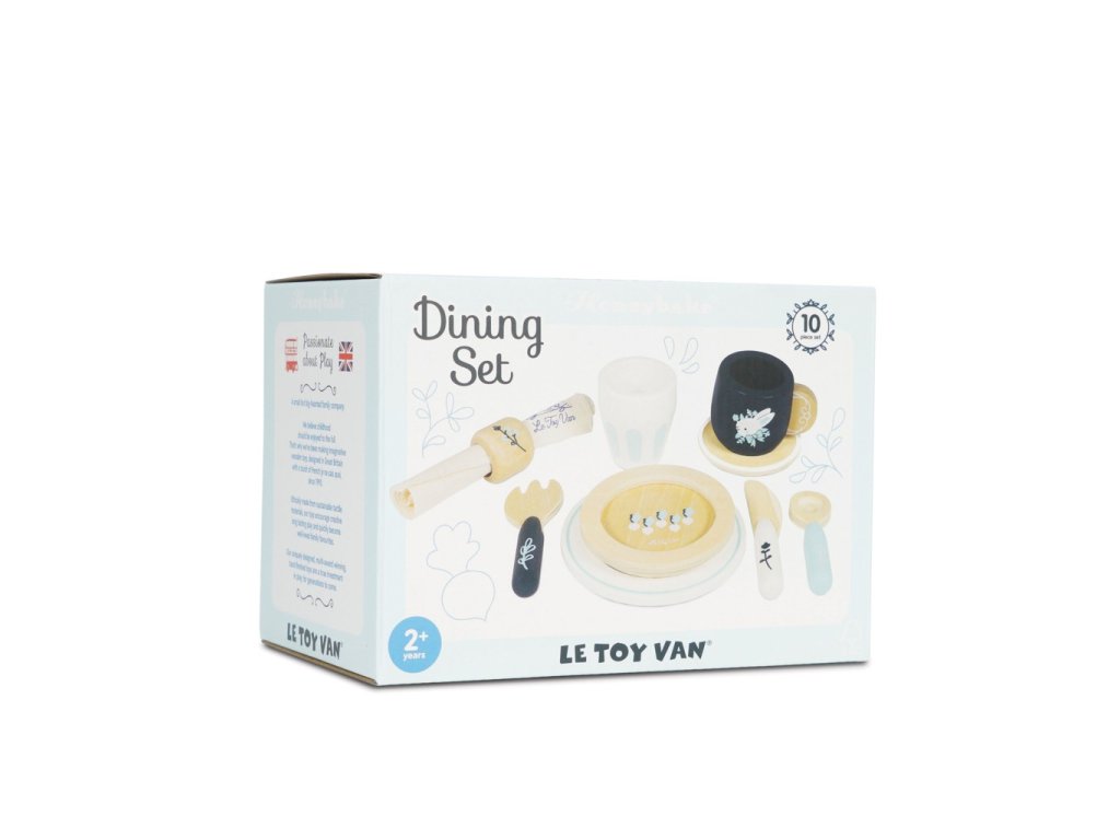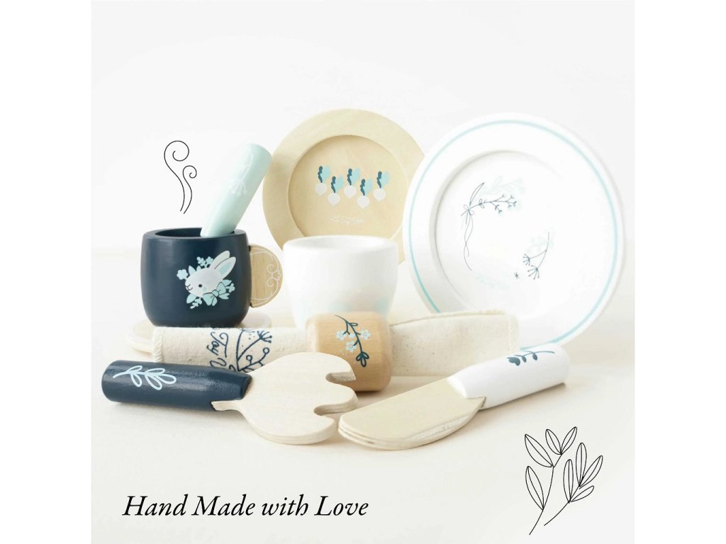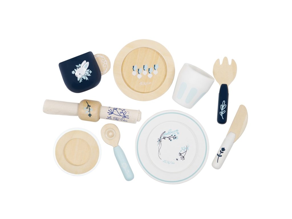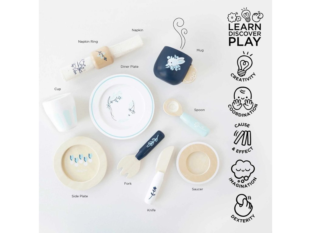 Oběd chutná lépe, když je servírován na pěkném nádobí. Tato hračka je udržitelná a vydrží vám opravdu dlouho. Přírodní barva dřeva, bílá a odstíny modré k sobě pěkně ladí, nechybí ani ilustrace rostlinek. V sadě najdete hrnek, podšálek, kelímek, 2 talíře, nůž, vidličku, lžíci a ubrousek s dekorativním kroužkem. Děti si při představivé hře procvičí jemnou motoriku, zručnost a koordinaci ruka-oko. Malováno netoxickými barvami na bázi vody. Hračky s účelemVšechny hračky firmy Le Toy Van jsou vyrobeny s cílem – aby dlouho vydržely. Designovány s láskou zkušenými řemeslníky za použití etických praktik a udržitelných materiálů, které jsou laskavější k naší planetě. Hlavní vlastnosti: vyrobeno eticky z udržitelného dřevatestováno dle nejpřísnějších standardůmalováno netoxickými barvami na bázi vodyinspiruje k představivé hřerozvíjí kognitivní dovednosti Honeybake kolekce: Hračky v této kolekci jsou vhodné k objevování, pomohou dětem s rozvojem představivosti, sociálních a verbálních dovedností a kognitivních funkcí. Tradiční design s moderními detaily děti jistě bude bavit. Honeybake je kolekce Le Toy Van, která vyhrála nejvíce ocenění, a to za design, kvalitu, bezpečnost a také za vzdělávací a herní hodnotu. Značka a certifikát FSC® (Forest Stewardship Council) zaručuje, že dřevo, ze kterého byl produkt vyroben, nebylo vytěženo nelegálně a pochází z lesů obhospodařovaných šetrným či přírodě blízkým způsobem, ve kterém jsou dodržovány přísné environmentální a sociální požadavky. Značka FSC® na výrobku znamená, že svým nákupem pomáháte chránit lesy a podporujete šetrné, odpovědné či přírodě blízké hospodaření, díky kterému jsou naše lesy stabilnější, zdravější, mají přirozenou druhovou skladbu a lépe odolávají negativním následkům klimatických změn.Doplňkové parametry