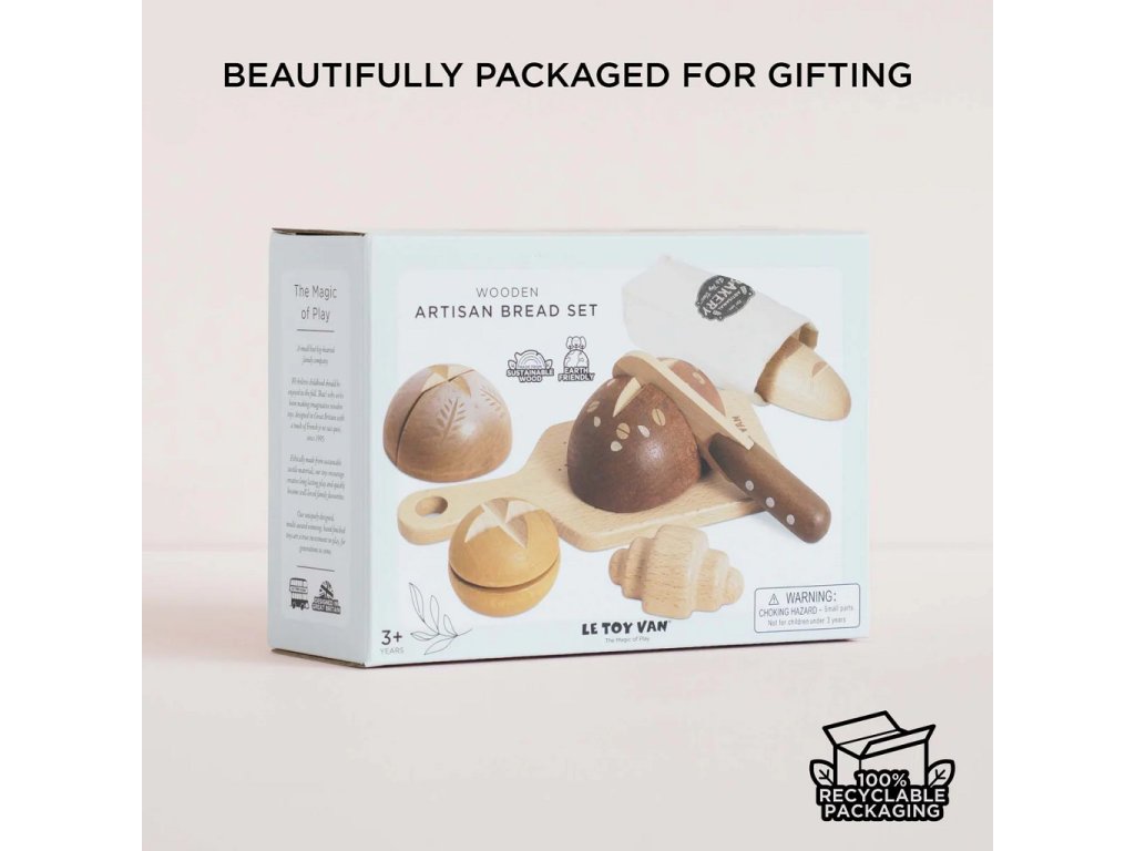 Přiveďte do dětského pokojíčku atmosféru malé pekárny nebo tržnice. Ideální vola pro malé pekaře a kreativní děti. Tento krásně zpracovaný dřevěný set zahrnuje různé druhy pečiva: semínkový chléb, country-chléb, housku, croissant i bagetu. Součástí je také měkký látkový pytlík, dřevěný nůž a dřevěné prkénko s rytými detaily. Pečivo je spojeno suchý zipem.Jedná se o ekologickou, udržitelnou hračku vyrobenou ze dřeva s certifikací FSC®. Materiál je pevný, přírodní a zodpovědně získaný. Povrch je upraven netoxickými barvami na vodní bázi, což je bezpečné pro děti. Tento set podporuje prostorovou představivost, kreativitu a jemnou motoriku. Děti si mohou hrát na pekárnu, obchod, domácí kuchyň nebo tržnici, sdílet hraní s kamarády či sourozenci, nacvičovat společenské interakce a představivou hru. Hlavní vlastnosti: kompletní dřevěný pekárenský set pro dětiobsahuje semínkový chléb, country chleba, housku, croissant, bagetu, látkový pytlík, dřevěné prkénko a nůžrealistické krájení díky suchým zipůmvyrobeno z FSC® certifikovaného dřeva Podporuje kreativitu, představivost a jemnou motorikurozvíjí fantazii, sociální dovednosti a koordinaci Značka a certifikát FSC® (Forest Stewardship Council) zaručuje, že dřevo, ze kterého byl produkt vyroben, nebylo vytěženo nelegálně a pochází z lesů obhospodařovaných šetrným či přírodě blízkým způsobem, ve kterém jsou dodržovány přísné environmentální a sociální požadavky. Značka FSC® na výrobku znamená, že svým nákupem pomáháte chránit lesy a podporujete šetrné, odpovědné či přírodě blízké hospodaření, díky kterému jsou naše lesy stabilnější, zdravější, mají přirozenou druhovou skladbu a lépe odolávají negativním následkům klimatických změn.Doplňkové parametry