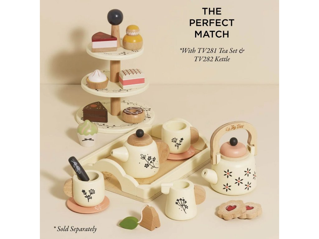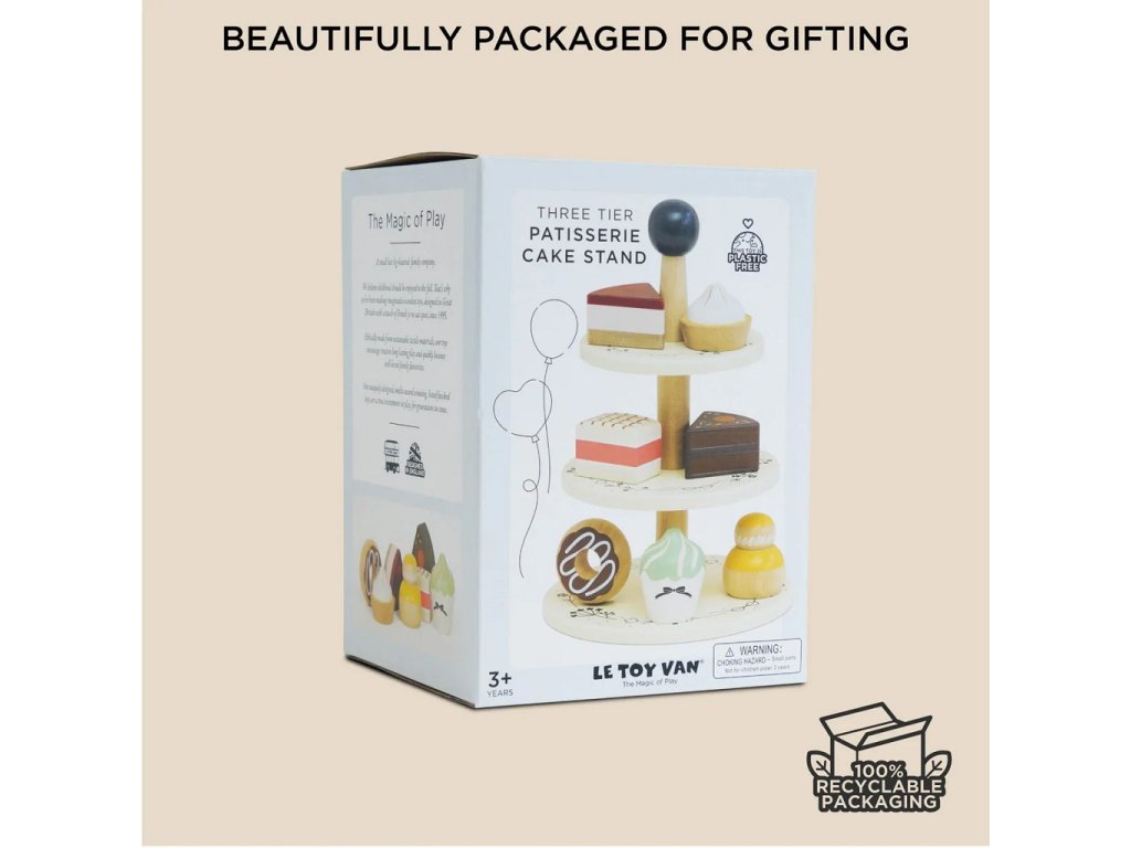 Přineste dětským hrám sladkou atmosféru a nekonečnou kreativní zábavu s tímto dokonalým doplňkem do dětské kuchyňky či herního koutku. Skvělá hračka pro malé cukráře i hospodyňky. Tento kvalitní stojan na dorty je ručně vyroben ze dřeva z udržitelných zdrojů, ekologicky lakován netoxickými vodovými barvami a plně bezpečný pro děti. Každé z tří pater je krásně zdobeno. Stojan je navržen tak, aby dokonale ladil s dalšími dřevěnými hračkami a doplňky.Součástí setu je 7 detailně zpracovaných dřevěných sladkostí. Hra s touto sadou sladkostí podporuje rozvoj fantazie, představivosti, jemné motoriky a sociální hry. Děti si mohou samy servírovat, krájet, nabídnout svým panenkám či kamarádům sladké pohoštění. Celý set je plast-free, šetrný k přírodě a navržen s myšlenkou dlouhodobé trvanlivosti, takže vydrží i opakované hraní.Ideální jako dárek pro děti od 3 let, ať už chcete doplnit dětskou kuchyňku, rozšířit sadu hraček nebo jen podpořit kreativitu a hraní formou role-play. Tento dřevěný stojan na dorty se snadno stane oblíbenou částí dětského herního světa. Hlavní vlastnosti: dřevěný stojan se třemi patry elegantní design 7 dřevěných dezertůvyroben z FSC® certifikovaného dřeva a netoxických vodových barev ekologický, bezpečný a vhodný pro dětipodporuje kreativitu, fantazii a jemnou motorikuskvělá pomůcka pro rozvoj sociálních dovedností a představivosti - děti si nacvičí sdílení, pohostinnost a scénáře z běžného života Značka a certifikát FSC® (Forest Stewardship Council) zaručuje, že dřevo, ze kterého byl produkt vyroben, nebylo vytěženo nelegálně a pochází z lesů obhospodařovaných šetrným či přírodě blízkým způsobem, ve kterém jsou dodržovány přísné environmentální a sociální požadavky. Značka FSC® na výrobku znamená, že svým nákupem pomáháte chránit lesy a podporujete šetrné, odpovědné či přírodě blízké hospodaření, díky kterému jsou naše lesy stabilnější, zdravější, mají přirozenou druhovou skladbu a lépe odolávají negativním následkům klimatických změn.Doplňkové parametry