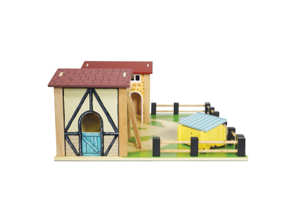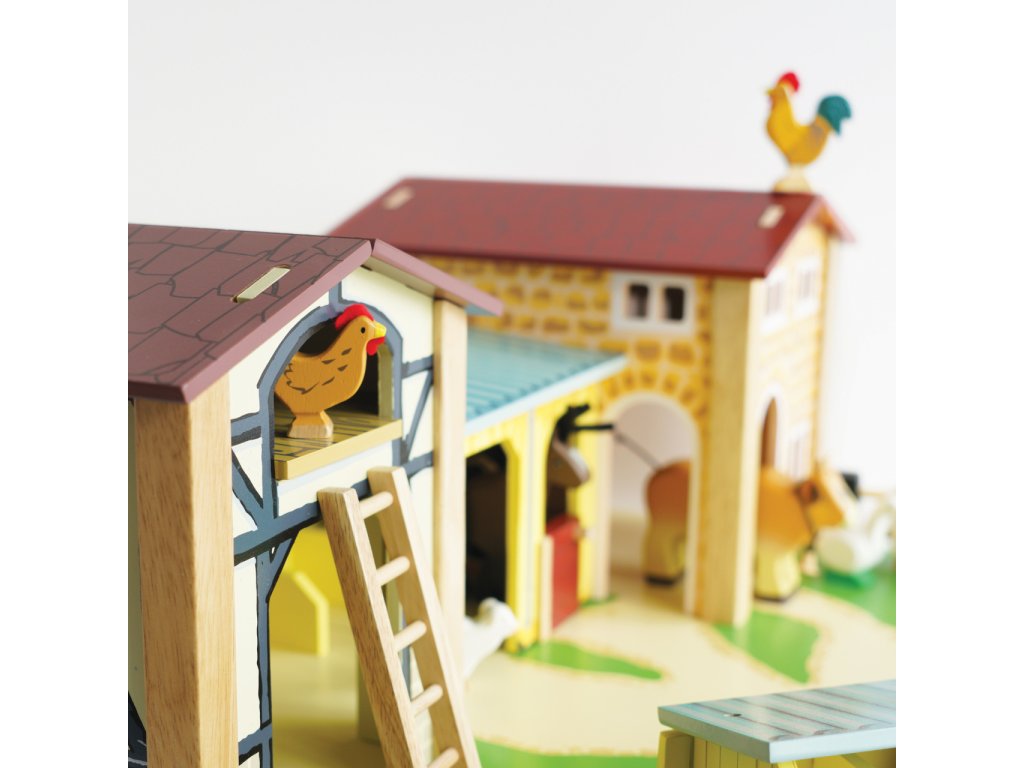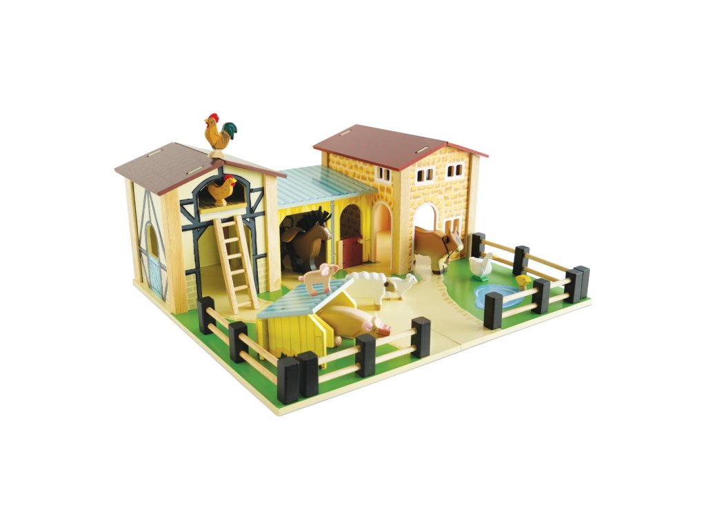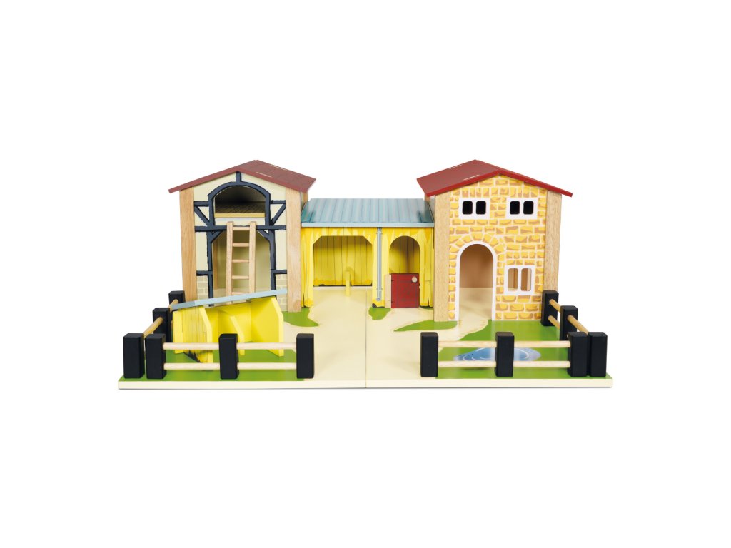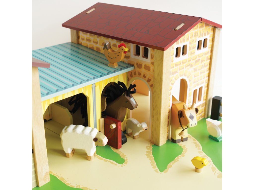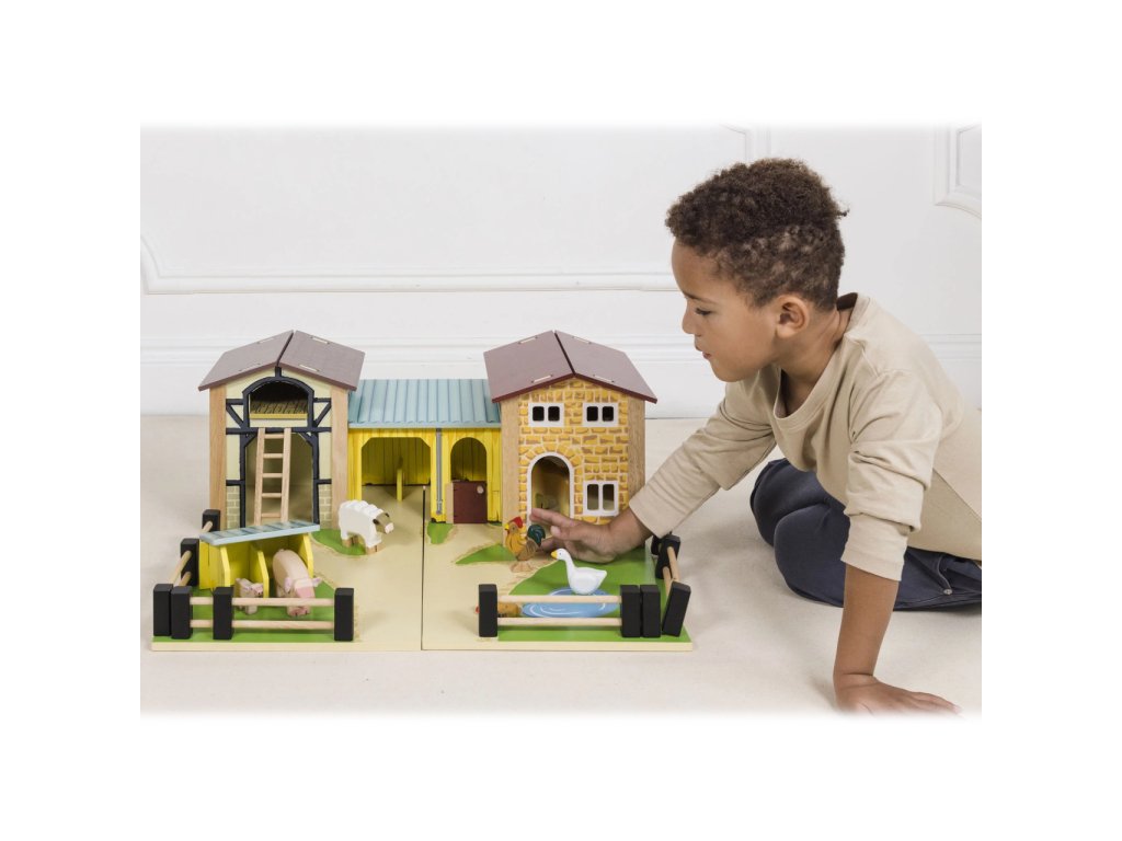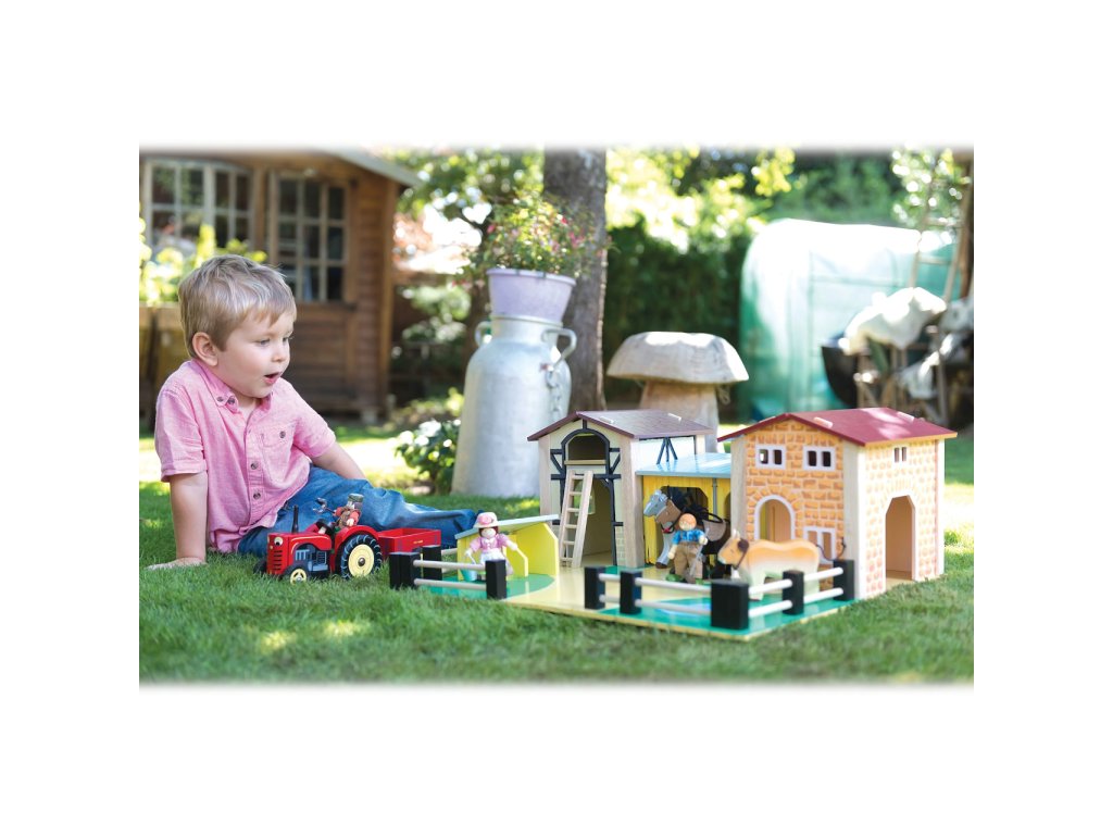 Klasická malovaná dřevěná farma od Le Toy Van. V balení najdete velkou sotodlu se seníkem, dojírnu, stáj a prasečí chlívek. Vše je upevněno na dekorované základové desce, na které jsou také oddělitelné ploty. Kompatibilní s figurkami Budkins, figurkami zvířátek – není součástí balení.
