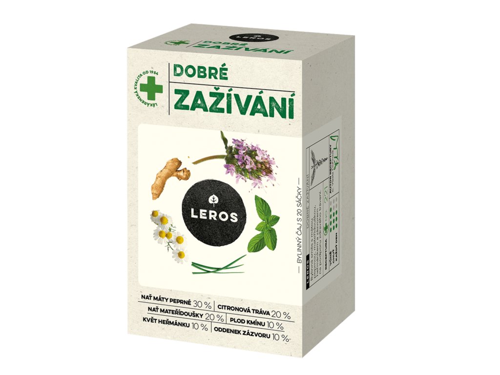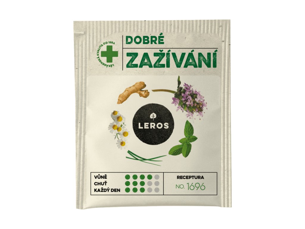 Bylinný čaj LEROS Dobré zažívání v praktických sáčcích je lahodnou směsí máty peprné, mateřídoušky, citronové trávy, zázvoru, heřmánku a kmínu. Tyto bylinky navozují příjemný pocit v žaludku a podporují klidné, harmonické trávení. Čisté složení bez lepku, konzervantů a umělých sladidel ocení i vegani a všichni, kdo dbají na přirozenost. Ideální k popíjení po jídle nebo kdykoliv během dne, stačí jeden sáček zalít horkou vodou a užít si chvilku klidu s příjemnou bylinkovou chutí.Doplňkové parametry