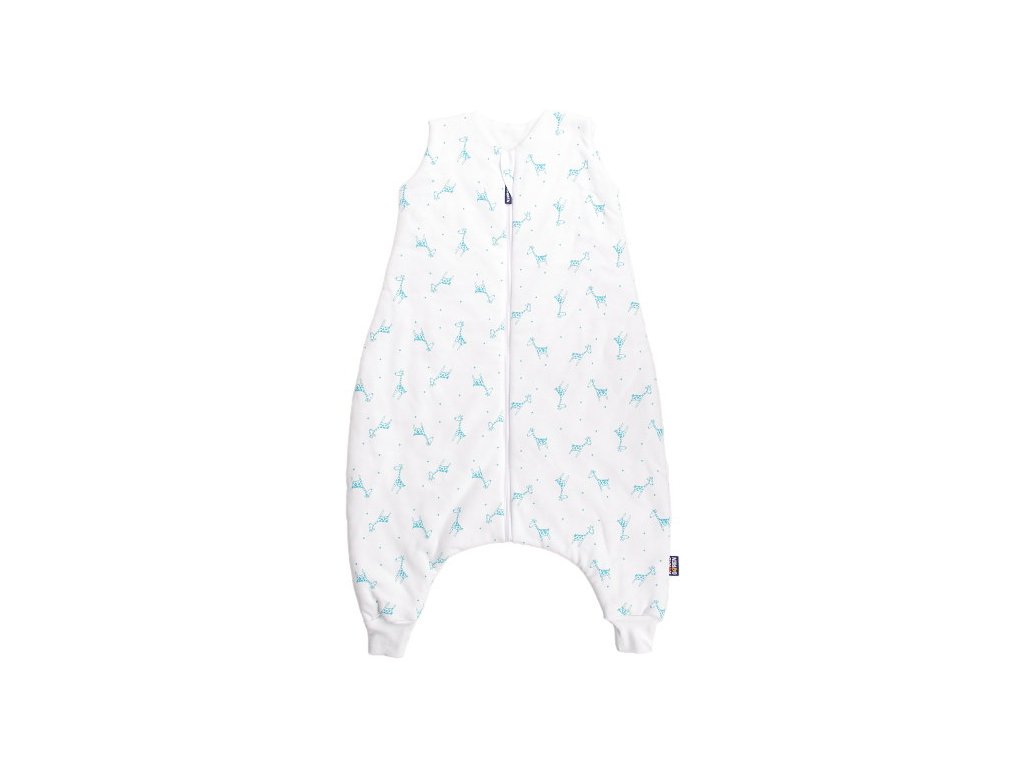 Dětský letní spací pytel s otvory pro nohy v bílé barvě s motivem žirafek v barvě aqua. Délka spacího pytle je cca 100 cm, lze jej prát v pračce při 30 °C. Spací pytel má uprostřed zip a lze jej zcela otevřít, navíc má zip látkovou krytku, která zabraňuje přiskřípnutí krku do zipu. Spací pytel je ušitý ze dvou vrstev: vrchní materiál 100% biobavlna, podšívka 100% biobavlna. Česká výroba.