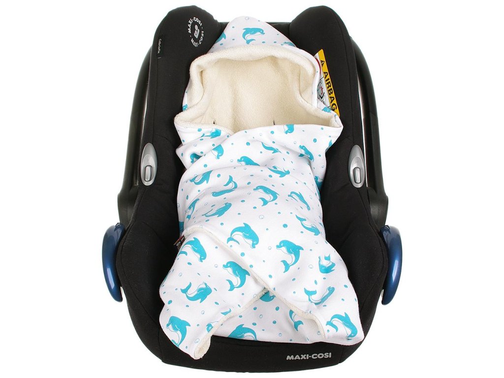 Letní zavinovačka do dětské autosedačky s tříbodovým zapínáním. Zavinovačka je s motivem aqua delfínků, je vyrobená ze 100% bio-bavlny, na dotyk je měkoučká a heboučká. Rozměr cca 75 x 75 cm, praní na 40 °C. Použití - vložit zavinovačku do autosedačky, otvory protáhnout bezpečnostní pásy, připoutat miminko, podle teploty zavinovačku zavinout a zapnout na suchý zip, nebo nechat otevřenou. Česká výroba.