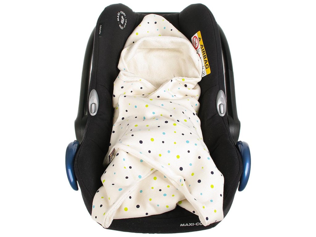 Letní zavinovačka do dětské autosedačky s tříbodovým zapínáním. Zavinovačka je s motivem puntíků, je vyrobená ze 100% bio-bavlny, na dotyk je měkoučká a heboučká. Rozměr cca 75 x 75 cm, praní na 40 °C. Použití - vložit zavinovačku do autosedačky, otvory protáhnout bezpečnostní pásy, připoutat miminko, podle teploty zavinovačku zavinout a zapnout na suchý zip, nebo nechat otevřenou. Česká výroba.
