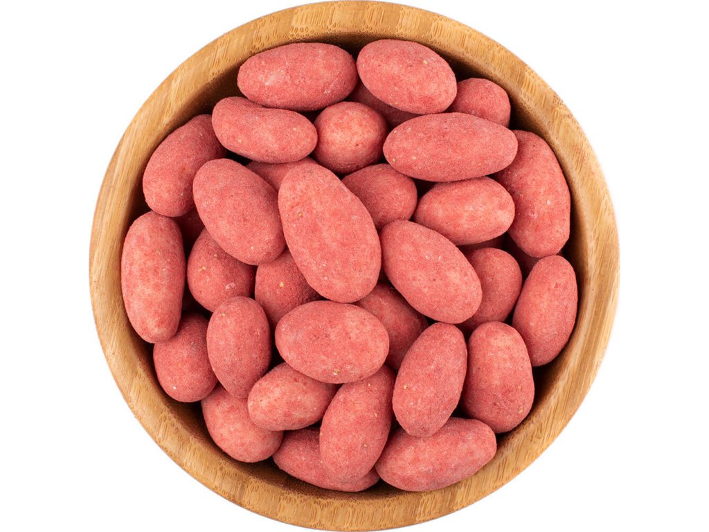 Zážitek z pravých jahod v každém soustu! Naše mandle v polevě z jahod a bílé čokolády vypadají jako jahody, chutnají jako jahody, ale jsou to mandle. Tyto vynikající mandle jsou totiž obalené v polevě z bílé čokolády a na závěr jsou posypané práškem z lyofilizovanými jahod.