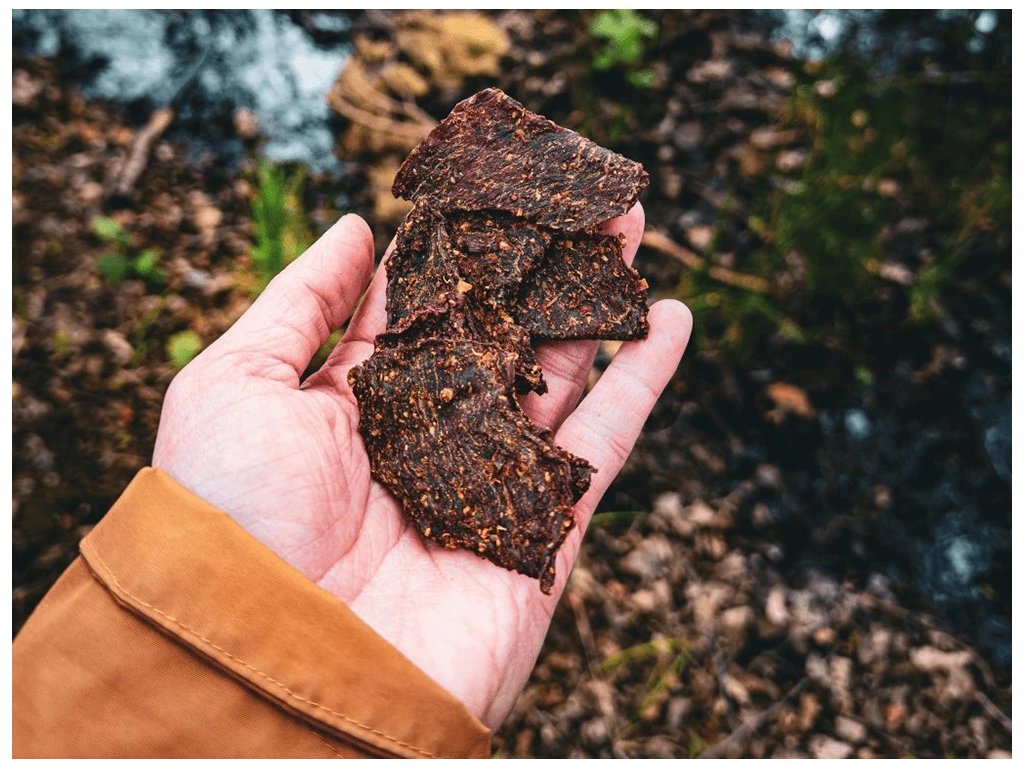Chutná skvěle, perfektní na zkus, zažene hlad a dodá šťávu. Kromě premiového hovězího, koření, špetky soli, sójové omáčky a Chiptole v něm nenajdeš nic dalšího. 100 % přírodní, ručně krájený. Ve složení nenajdeš žádný éčka, zvlhčovadla nebo podobný srajdy.