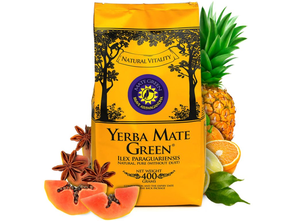 Čaj yerba maté (Ilex paraguariensis) 83 %, ašvaganda 2 %, citronová kůra, pomerančová kůra, ananas (ovoce), papája (ovoce), anýz (ovoce), heřmánek (květ), senna, přírodní aroma.