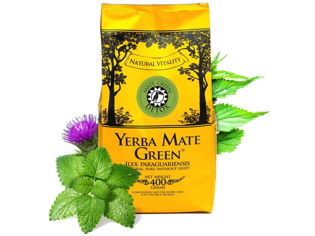 Obsahuje 92% yerby a 8% bylinek, včetně plodů ostropestřce (obsahují 2-3% silymarinu) a listů meduňky. Plody ostropestřce jsou ideální pro detoxikaci jater. Mate Green Detox chutná nejlépe připravené za studena. Je ideální pro všechny, kteří plánují jarní očistu, snaží se zhubnout nebo si jednoduše chtějí pochutnat na kvalitním maté.