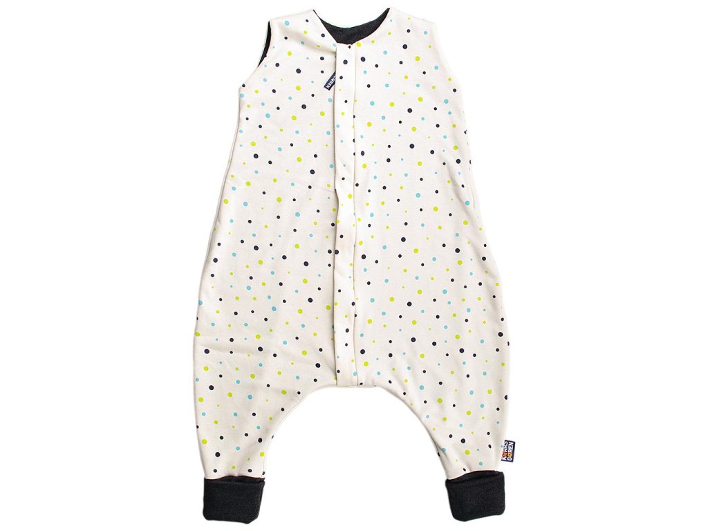 Nožičkový spací pytel s podšívkou z úpletu z černé merino vlny. Vnější strana je ze 100% bio-bavlny s motivem puntíků. Délka spacího pytle je 60 cm - to je délka miminka od ramen ke kotníkům. Zip umožní otevření spacího pytle po celé délce v obou směrech a má látkovou krytku, která zabraňuje přiskřípnutí krku do zipu. Ruční praní. Nepoužívat aviváž! Česká výroba.