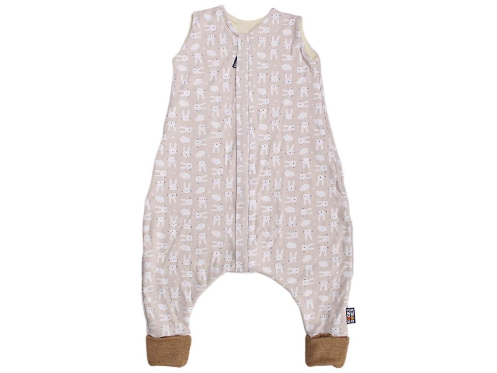Nožičkový spací pytel s podšívkou z úpletu z merino vlny. Vnější strana je ze 100% bavlny s motivem béžových zajíčků. Délka spacího pytle je 60 cm - to je délka miminka od ramen ke kotníkům. Zip umožní otevření spacího pytle po celé délce v obou směrech a má látkovou krytku, která zabraňuje přiskřípnutí krku do zipu. Nohavice jsou z merino vlny a je možné je překlopením uzavřít. Ruční praní do 30 °C, nebo jemné praní na vlnu při minimálních otáčkách. Nepoužívat aviváž! Česká výroba.