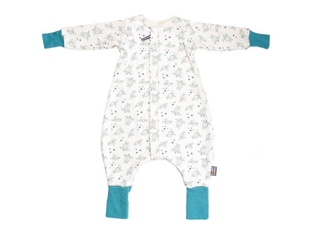 Nožičkový spací pytel s odepínacími rukávy, podšívka je z úpletu z merino vlny. Vnější strana je ze 100% bio-bavlny s motivem želviček. Délka spacího pytle je 60 cm - to je délka miminka od ramen ke kotníkům. Zip umožní otevření spacího pytle po celé délce v obou směrech a má látkovou krytku, která zabraňuje přiskřípnutí krku do zipu. Rukávy se připínají pomocí druků. Ruční praní do 30 °C. Nepoužívat aviváž! Česká výroba.
