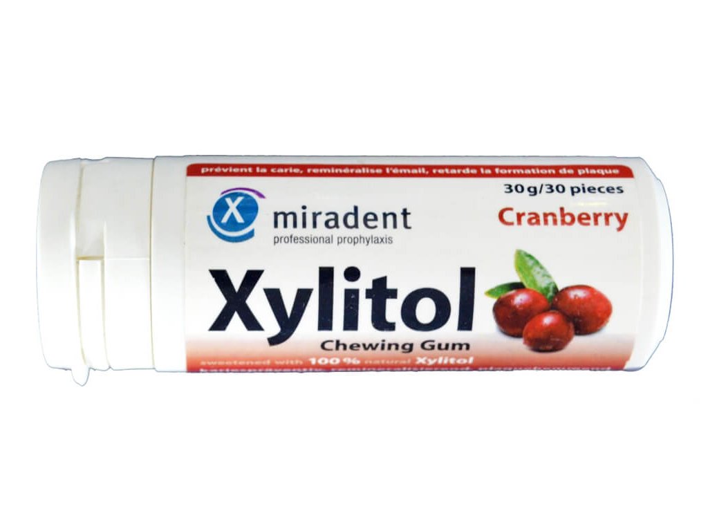 Xylitol ve žvýkačkách Miradent napomáhá udržovat v dutině ústní rovnováhu a chrání tak zuby před plakem a kazem. Zvyšuje také tvorbu slin, čímž zamezuju pocitu suchosti v ústech. Příjemná brusinková příchuť pak osvěží a probudí vaše smysly.