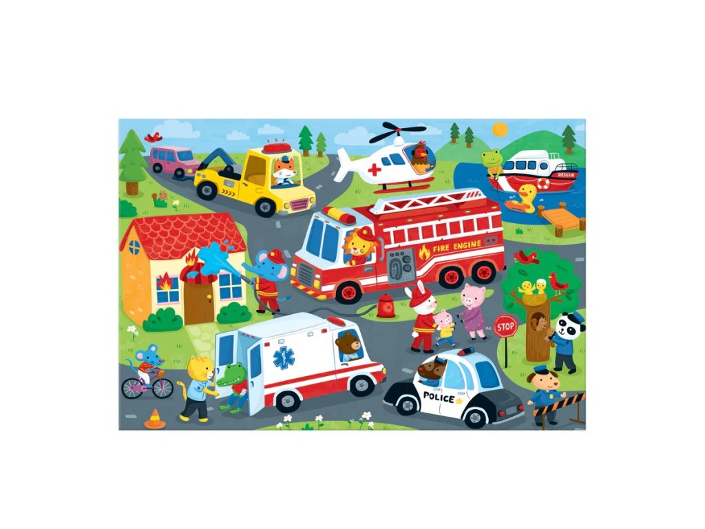 Podlahové puzzle obsahuje 48 dílků. Zobrazuje všechny možné druhy záchranných vozidel. Velké kousky jsou ideální pro malé dětské ruce. Puzzle jsou vyrobeny za použití významného podílu recyklovaného papíru a nabízí špičkový potisk nezávadnými barvami. Jsou opatřeny matnou povrchovou úpravou, která zajišťuje za všech okolností věrné podání detailů i barev. Jejich zadní strana je potažena hladkým, na dotek příjemným povrchem, díky němuž se při skladování rozloženého puzzle netvoří prach. Spolu s pečlivě zabalenými dílky naleznete v balení také letáček s návodným obrázkem, který zpravidla obsahuje další informace o tvůrcích a pozadí vzniku díla. Dodáváno v mimořádně pevné a poutavě zpracované kartonové krabičce vyrobené z recyklovaného kartonu. Hlavní vlastnosti: 48 precizně vyřezaných dílkůvyrobeno s použitím recyklovaných a udržitelně získaných materiálůpečlivě vybraný motiv od renomovaných tvůrců a umělcůpotisk a provedení nejvyšší kvalityobsahuje návodný obrázekDoplňkové parametry