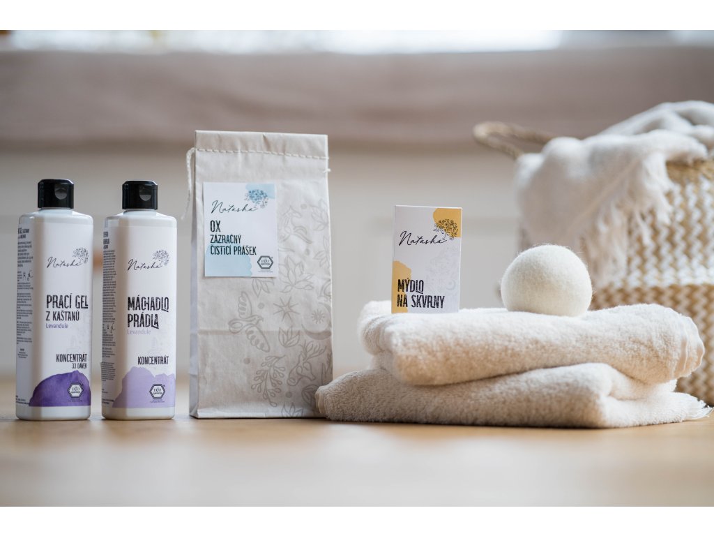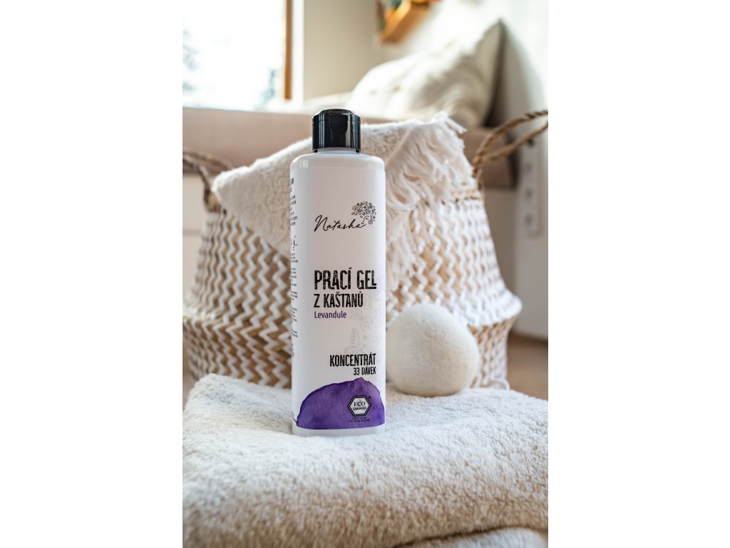 Vysoce koncentrovaný prací gel z koňských kaštanů je skvělý pro šetrné praní přírodních i syntetických materiálů. Poradí si s barevným i bílým prádlem, a to včetně látkových plen. Prát můžete v pračce, v ruce i v přírodě – gel je 100% biologicky rozložitelný a rozumí si i s domácími čističkami vod. Díky šetrnému složení je vhodný i pro citlivou pokožku. Prádlo gel na praní příjemně provoní esenciálním olejíčkem z levandule.. PROKLEPNUTO: Jak se saponiny z kaštanů poperou s nečistotami a zatuchlým prádlem? Prací gel Natasha na vlastní prádlo prubla naše testerka a podělila se o zkušenosti dojmy v upřímné recenzi na blogu, mrkejte – dozvíte se tam třeba, jestli 8 ml gelu zvládne vyprat kupu špinavého prádla.. [[8veciprani]]Doplňkové parametry