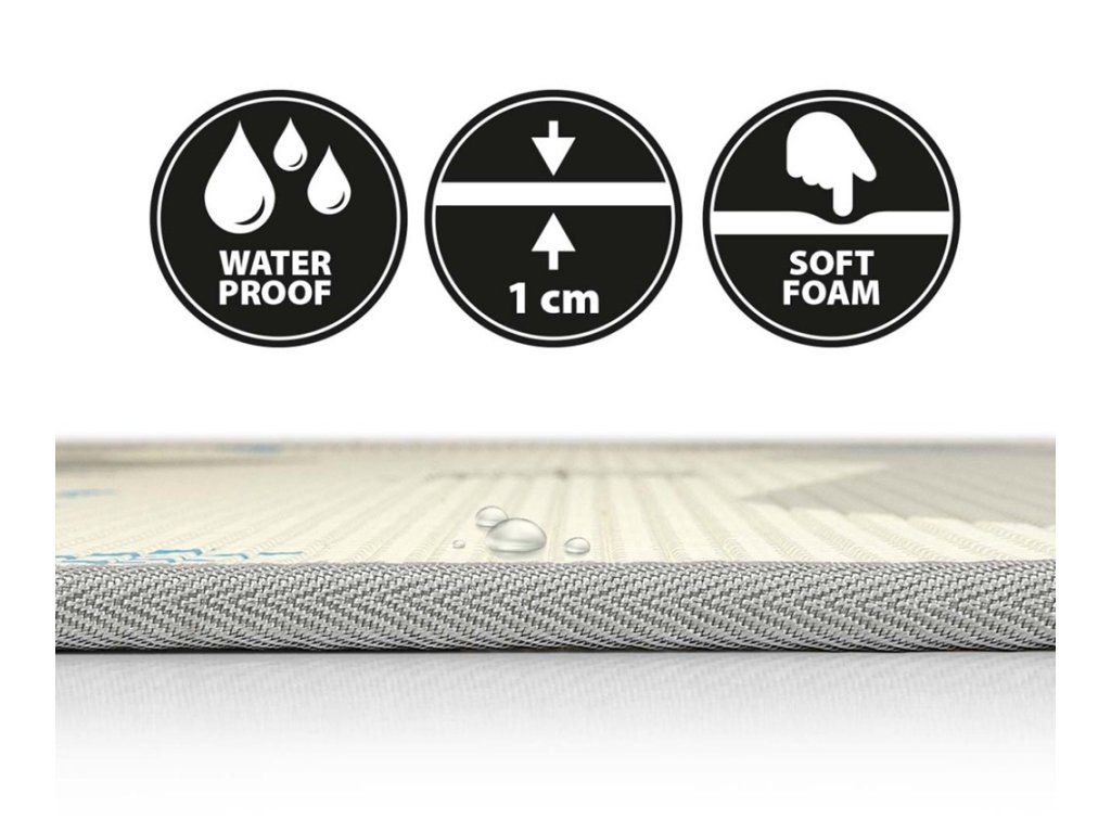 Kreativní a barevné vzory podložky povzbuzují aktivitu, zejména v raných fázích vývoje. Plochý povrch pěnové podložky umožňuje vašemu dítěti modelovat stabilní trup, přirozeně a volně otáčet hlavou, procvičovat rotace, opírat se, správně zatěžovat nohy a stabilně a bezpečně sedět. Rolovací pěnová podložka KINDER je bezpečným a pohodlným místem pro hraní. Produkt poskytuje vynikající izolaci od studených podlah a díky nepromokavému povrchu se snadno čistí a je ideálním doplňkem do každého pokoje. Jeho vysoká flexibilita zajišťuje vynikající tlumení nárazů v případě pádu. Lze jej použít i venku na hladkém povrchu. Naše podložka je také ideální na cesty.