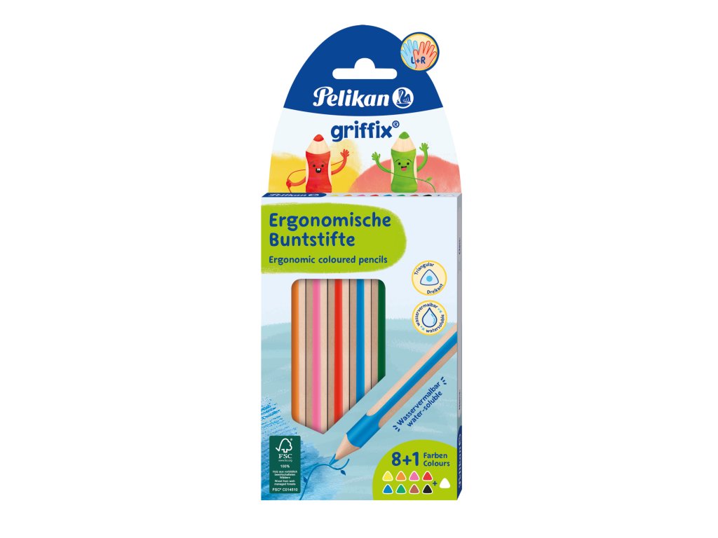 trojhranné pastelky 8 ks a 1 ks bílá barva, ergonomické, lesní certifikace FSC, délka 140 mm vhodná pro děti, síla tuhy 4 mm, rozpustné ve vodě, na blistru