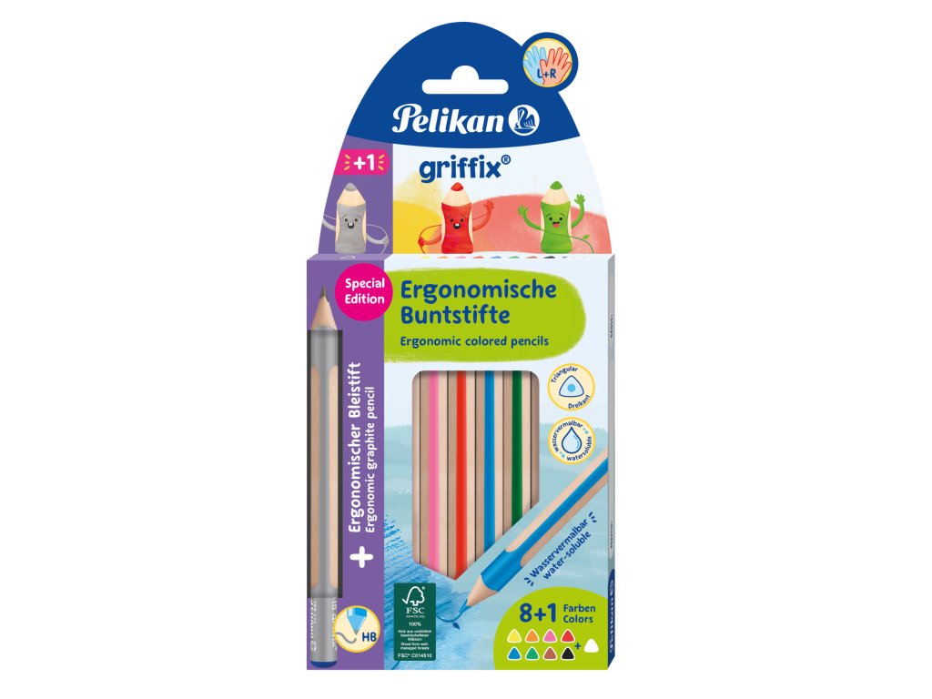 silné trojhranné pastelky 9 ks a 1 ks tužka HB (číslo 2), ergonomické, délka 140 mm vhodné pro malé děti, síla tuhy 4 mm, lesní certifikace FSC, rozpustné ve vodě, na blistru