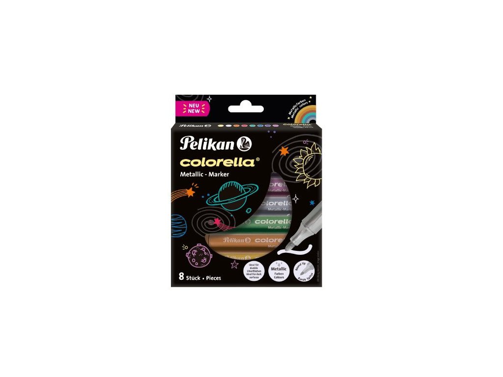 S fixy Colorella® Metallic od společnosti Pelikan se fantazii při malování a tvoření meze nekladou. Plnicí pera Colorella® Metallic vytvářejí lesklý kovový efekt na všech površích a dodávají předmětům mimořádný kovový lesk. Pigmentový inkoust per s vláknovým hrotem je na vodní bázi, a proto je omyvatelný z hladkých povrchů, jako je sklo, kov, porcelán, plasty atd. Díky robustnímu kulatému knotu lze malovat i jemné linie a trvalá aplikace na porézní povrchy, jako je látka, dřevo, karton atd., je hračka. Mimochodem: kovové fixy jsou ideální na tmavé povrchy.