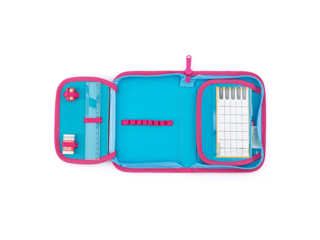 Jednopatrový školní penál s 2 chlopněmi, prázdný obsahuje 25 gumových poutek pro uchycení psacích potřeb. Na vnitřních chlopních jsou průhledné fólie pro rozvrh hodin.Doplňkové parametry