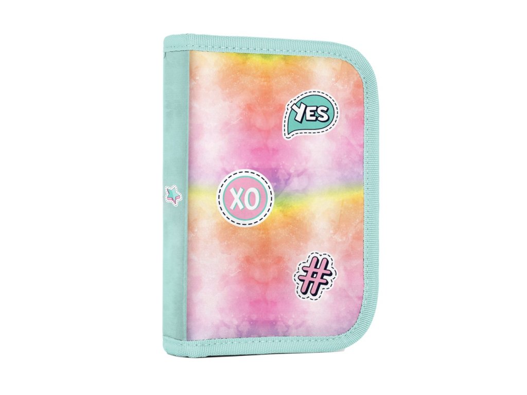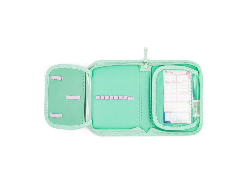 Jednopatrový školní penál s 2 chlopněmi, prázdný obsahuje 25 gumových poutek pro uchycení psacích potřeb. Na vnitřních chlopních jsou průhledné fólie pro rozvrh hodin.Doplňkové parametry