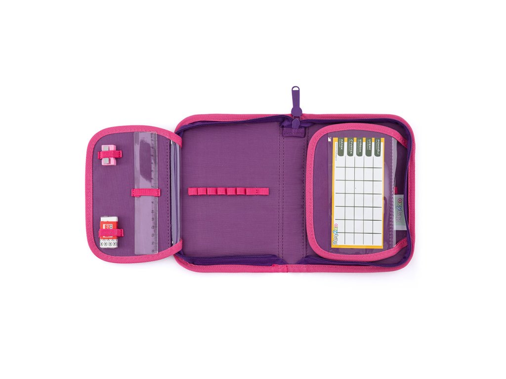 Jednopatrový školní penál s 2 chlopněmi, prázdný obsahuje 25 gumových poutek pro uchycení psacích potřeb. Na vnitřních chlopních jsou průhledné fólie pro rozvrh hodin.Doplňkové parametry