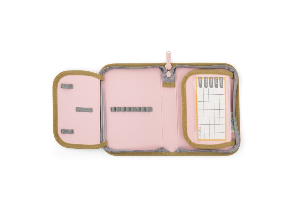Jednopatrový školní penál s 2 chlopněmi, prázdný obsahuje 25 gumových poutek pro uchycení psacích potřeb. Na vnitřních chlopních jsou průhledné fólie pro rozvrh hodin.Doplňkové parametry