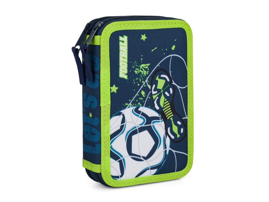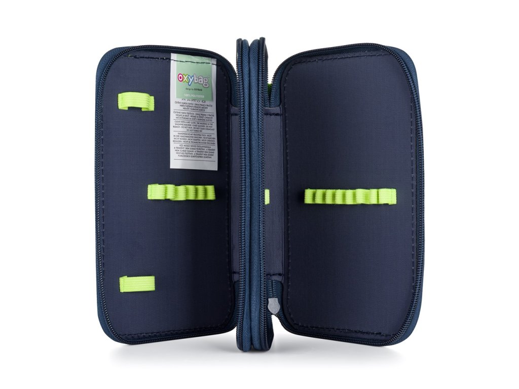 Školní penál dvoupatrový bez náplně. Penál obsahuje 25 gumových poutek pro uložení všech psacích potřeba a drobností potřebných k výuce. Penál má pevný zip s velkými taháčky pro snadnou manipulaci. Jedno patro je opatřeno průhlednou přihrádkou pro týdenní rozvrh.