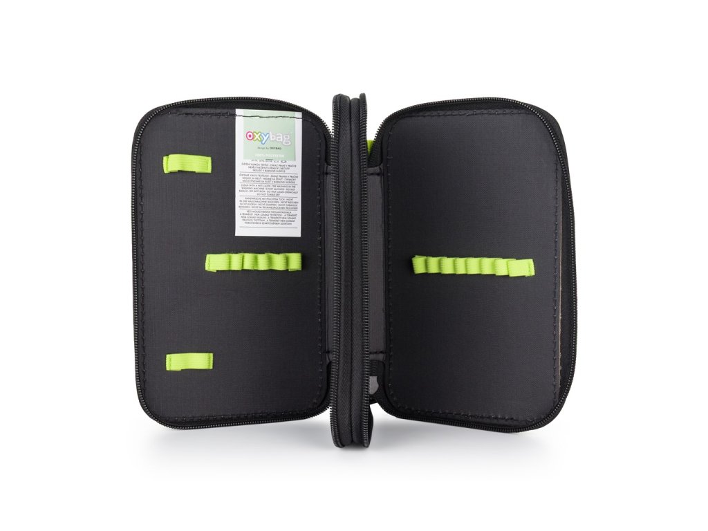 Školní penál dvoupatrový bez náplně. Penál obsahuje 25 gumových poutek pro uložení všech psacích potřeba a drobností potřebných k výuce. Penál má pevný zip s velkými taháčky pro snadnou manipulaci. Jedno patro je opatřeno průhlednou přihrádkou pro týdenní rozvrh.Doplňkové parametry