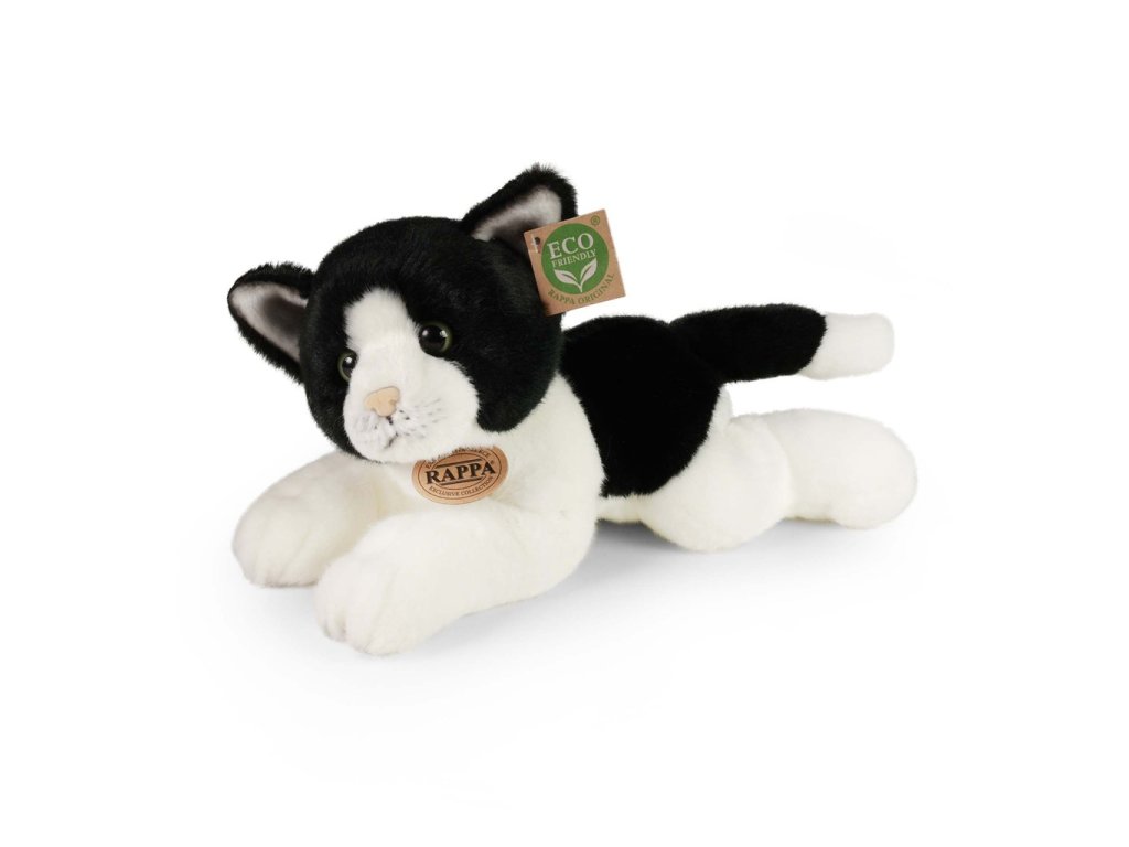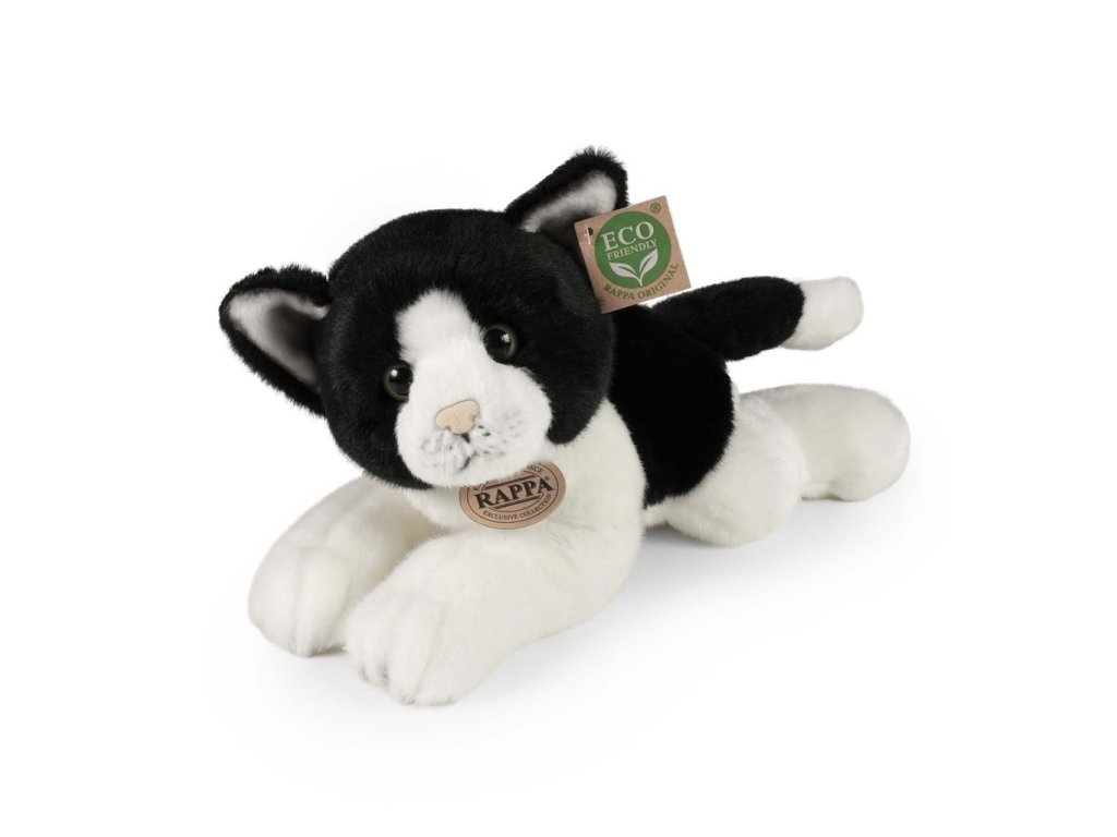 Rappa Plyšová kočka bílo-černá ležící 30 cm ECO-FRIENDLY Krásná bílo-černa kočka přece nesmí chybět ve tvé sbírce plyšových zvířátek! Roztomilá kočička o velikosti 30 cm je vyrobena z vysoce kvalitní, heboučké plyše a díky tomu vypadá jako živá a je tak součástí exkluzivní kolekce plyšových hraček. Tento plyšový kousek je ideálním dárkem pro malé i velké milovníky plyšáků. Hlavní vlastnosti: ECO-FRIENDLY Co to vlastně ECO-FRIENDLY znamená? Výplň plyšové hračky je vyrobena z recyklovaných PET lahví. Tento materiál je zcela bezpečný, na omak nerozeznatelný od standartní výplně a plně atestovaný pro bezpečnost i těch nejmenších. Rozhodli jsme se jít zelenou cestou co nejméně zatěžující životní prostředí- cestou ECO-FRIENDLY.Doplňkové parametry