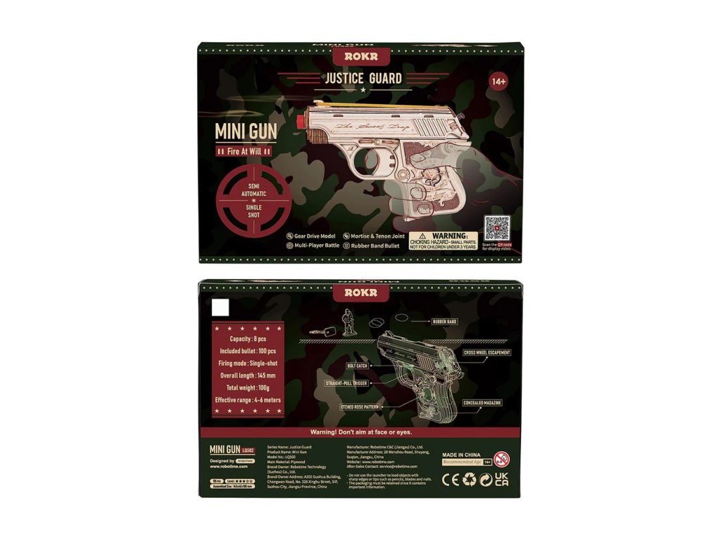 Justice Guard mini pistole je elegantní kompaktní pistole, která působí tak reálně, že nebudete věřit, že jde o dřevěnou skládačku. Poskládejte si tuto bezpečnou a nenápadnou detailně propracovanou poloautomatickou pistoli velikostí vhodnou tak akorát do kapsy nebo kabelky. Je malá a přesná, ale také bezpečná díky gumičkovým nábojům. Má odnímatelný zásobník a pohyblivou spoušť, které jsou vyrobené z vysoce kvalitního plastu s nízkým koeficientem tření. Ručním natažením 8 gumiček a stisknutím spouště plynule střílíte. Spoušť vydává zvuk cvaknutí, jako by se jednalo o skutečnou zbraň. Pistole je ozdobena leptanými vzory a nápisy. Hlavní vlastnosti: 115 přesných dílkůbez použití lepidlastřední obtížnost sestaveníozdobena jemnými vzory a nápisyodnímatelný zásobník100 ks gumičkových nábojůpoloautomatická zbraňnízká hmotnost 100 gdostřel 4-6 mDoplňkové parametry