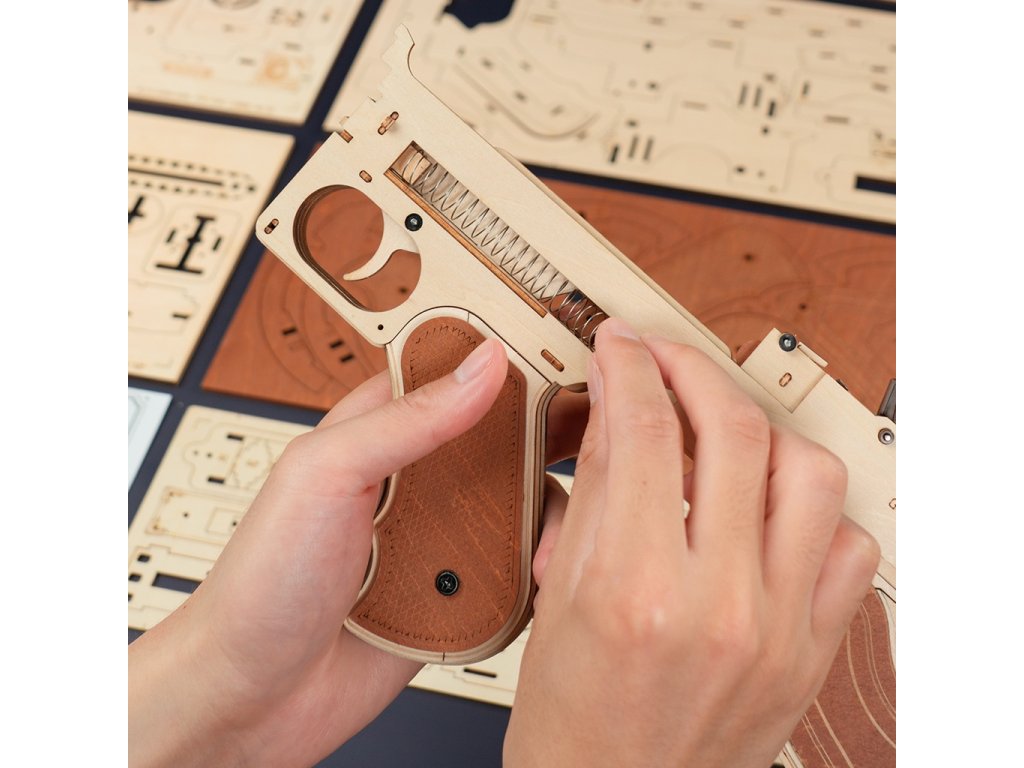 Kdo by nechtěl poznat vzrušení ze sestavení vlastní realistické zbraňové repliky? Představujeme vám fascinující RoboTime 3D Dřevěné mechanické puzzle Samopal Thompson. Tento samopal je tak realistický, že vás zaručeně zaujme! S jeho 275 díly a perfektními detaily vám přinese hodiny zábavy a uspokojení z dokončení tohoto unikátního projektu. Co kdybychom vám řekli, že tento model samopalu má dva režimy střelby a ve skutečnosti můžete střílet gumičky? Tento model je nejen esteticky atraktivní, ale také funkční! Navíc, díky jeho preciznímu laserovému řezání je každý kus dokonale vystižený a připravený k sestavení. Tahle hračka je nejen skvělá pro děti starší 14 let, ale i pro dospělé, kteří mají rádi výzvy a chtějí si užít několik hodin koncentrované zábavy. Po dokončení této zábavné stavěcí výzvy budete mít u sebe doma skutečný sběratelský kousek. Představte si, jak tento úžasný samopal vystavujete na polici a všichni, kdo ho uvidí, budou z něj nadšení. Zároveň může sloužit jako funkční hračka. Upozornění: Není vhodné pro děti do 3 let, obsahuje malé součásti – hrozí nebezpečí udušení. Balící materiál není hračka. Hlavní vlastnosti: 275 leaserem řezaných dílůobtížnost nízkávhodné od 14 letDoplňkové parametry