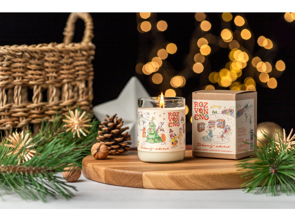 Útulnou atmosféru ladovské zimy ukryli v moravském Rozvoněno do 100% přírodní svíčky, ručně vymazlené ze smetanově bílého kokosovo-sójového vosku a esenciálních olejíčků z vanilky, mandle a muškátového oříšku. Kromě jemné vůně, která nápadně připomíná marcipán, svíčka zútulní domov upcyklovaným skleněným obalem vyrobeným z lahve od vína s pečlivě zabroušenými okraji, aby posloužil i po dohoření světlonošky. Sklenička je zdobená originální vánoční ilustrací s číslicemi od 1 do 24, a tak můžete odškrtávat (anebo jen odpočítávat) zbývající dny do kouzelného Štědrého dne.. Svíčka je vegan friendly, neobsahuje ani kapku palmového oleje nebo syntetických ingrediencí. Ve srovnání s parafínovými svíčkami hoří až o polovinu déle (až 55 hodin), nešíří kolem sebe kontroverzní látky a je 100% biologicky odbouratelná.Doplňkové parametry