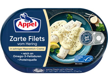 Appel Filety sleďové ve smetanovo - křenové omáčce, to jsou kvalitní sledi v lahodné jemné omáčce s pikantní chutí křenu.