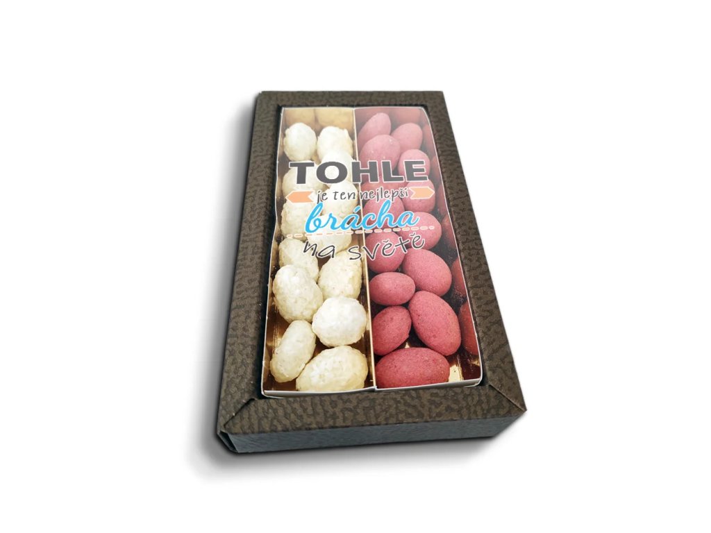 První dojem zajistí dárková krabička s originálním motivem. Osobní věnování udělá vždy radost. Průhledné víko navíc nabídne krásný pohled na lahodné mandle v čokoládě.