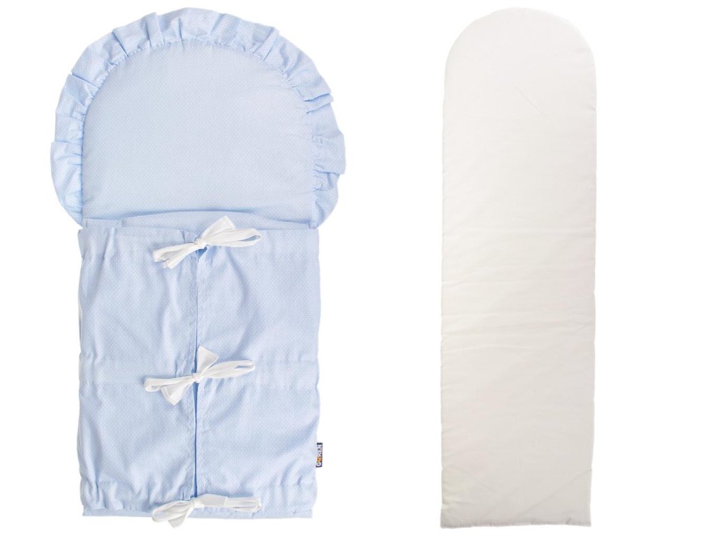 Sada potah klasické zavinovačky s trojitým vázáním ve světle modré barvě s motivem puntíků a výplň do zavinovačky. Povlak zavinovačky je ze 100% bavlny a lze ho prát v pračce na 40° C, velikost povlaku a tedy i zavinovačky je cca 115 x 33 cm. Složení materiálu vložky (výplně) zavinovačky: povrch 100% bavlna, výplň 100% polyester. Výplň lze prát v pračce na 30° C, má rozměr cca 110 x 33 cm. Zavinovačka je vhodná jako výbava do porodnice, protože novorozená miminka jsou zvyklá na těsný prostor maminčina bříška a po zavinutí se cítí bezpečně a rychle se zklidní.