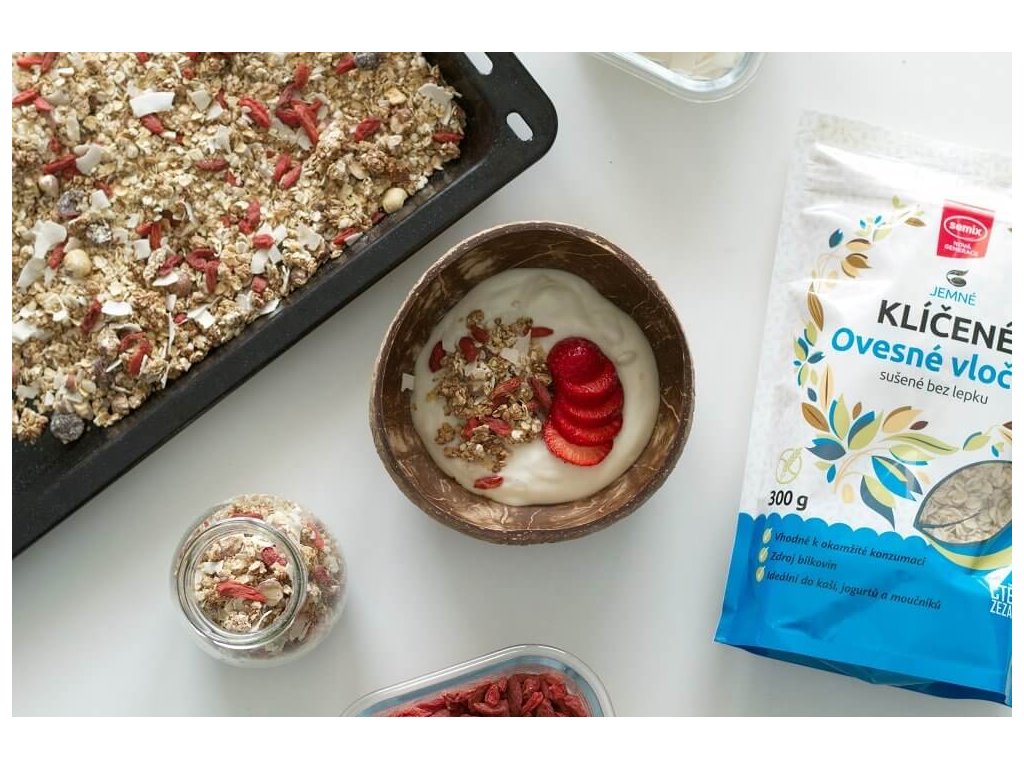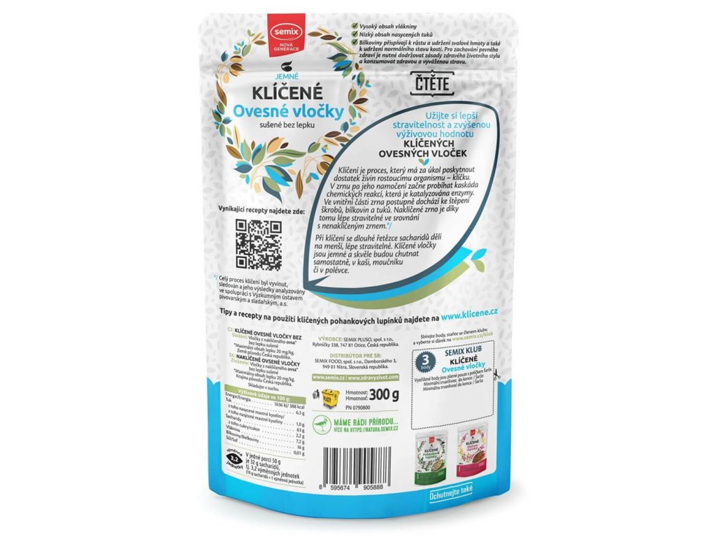 Užijte si lepší stravitelnost a zvýšenou výživovou hodnotu klíčených ovesných vloček bez lepku. Klíčené ovesné vločky bez lepku jsou ideální na snídani s mlékem, jogurtem nebo ovocným džusem, ale také do moučníku či do polévky. Díky tepelné úpravě jsou vhodné k okamžité konzumaci. Jsou zdrojem bílkovin a mají vysoký obsah vlákniny.